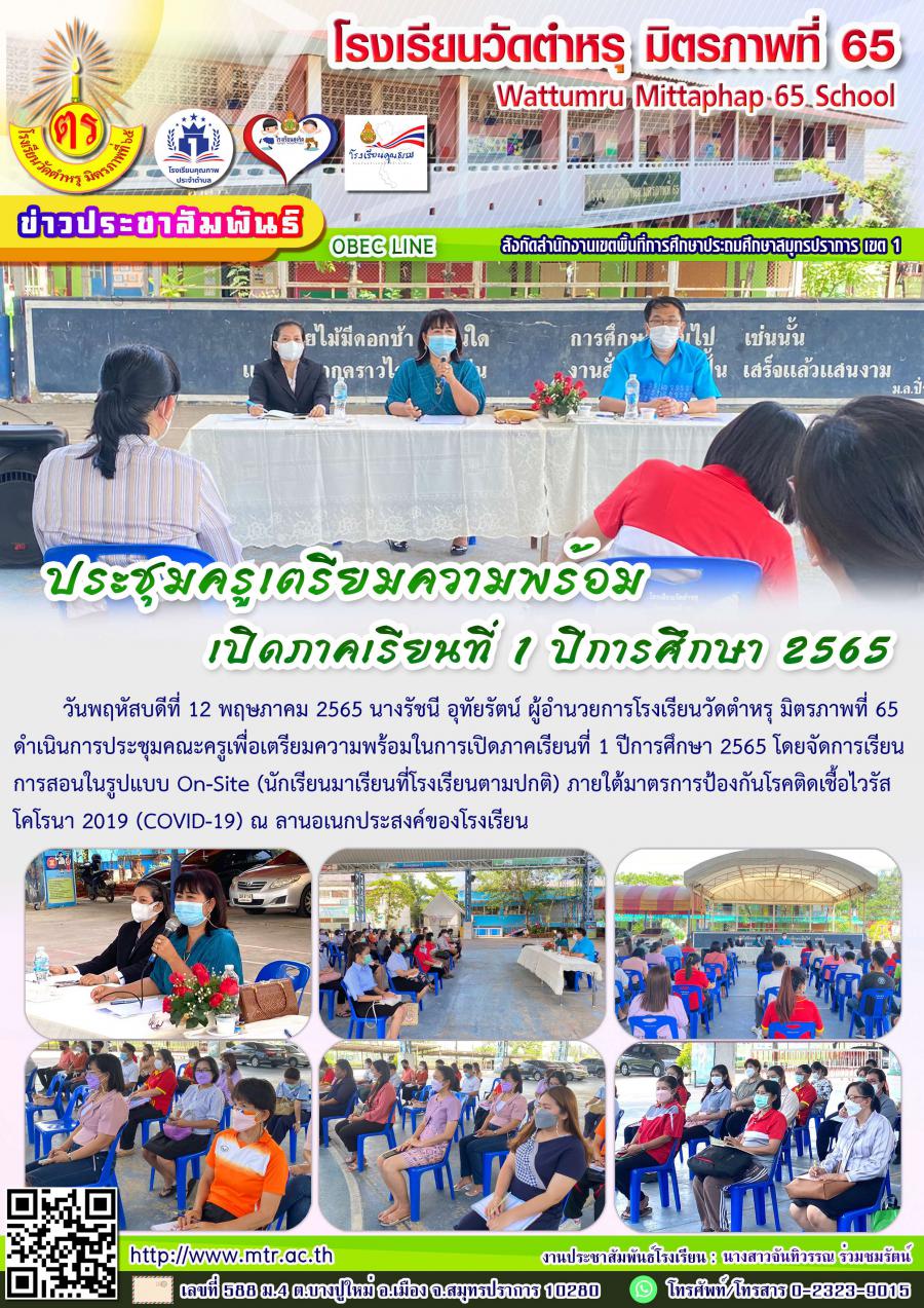 วันพฤหัสบดีที่ 12 พฤษภาคม 2565 นางรัซนี อุทัยรัตน์ ผู้อำนวยการโรงเรียนวัดตำหรุ มิตรภาพที่ 65 ดำเนินการประชุมคณะครูเพื่อเตรียมความพร้อมในการเปิดภาคเรียนที่ 1 ปีการศึกษา 2565 โดยจัดการเรียนการสอนในรูปแบบ On-Site (นักเรียนมาเรียนที่โรงเรียนตามปกติ) ภายใต้มาตรการป้องกันโรคติดเชื้อไวรัสโคโรนา 2019 (COVID-19) ณ ลานอเนกประสงค์ของโรงเรียน