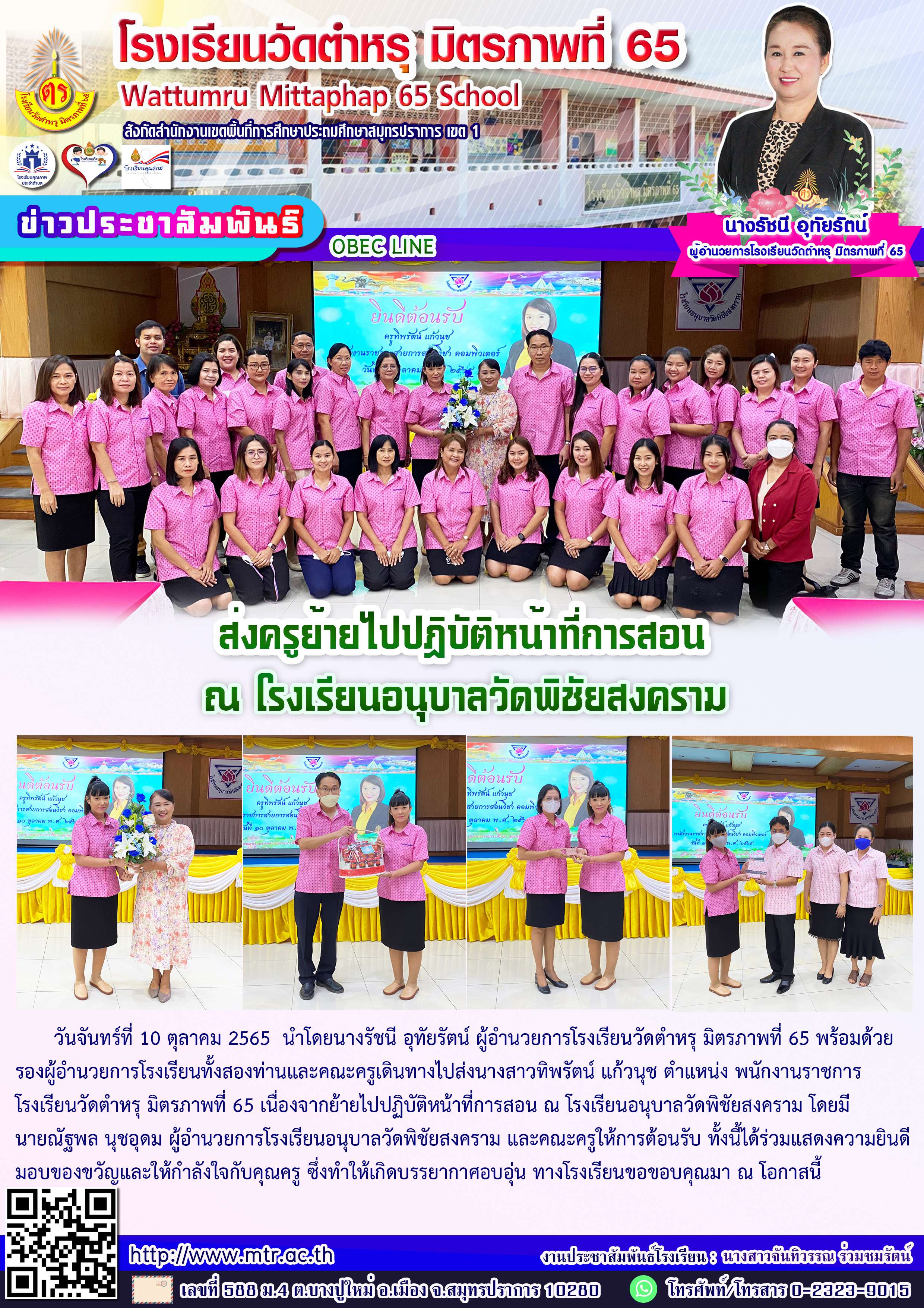 วันจันทร์ที่ 10 ตุลาคม 2565 นำโดยนางรัชนี อุทัยรัตน์ ผู้อำนวยการโรงเรียนวัดตำหรุ มิตรภาพที่ 65 พร้อมด้วยรองผู้อำนวยการโรงเรียนทั้งสองท่านและคณะครูเดินทางไปส่งนางสาวทิพรัตน์ แก้วนุช ตำแหน่ง พนักงานราชการ โรงเรียนวัดตำหรุ มิตรภาพที่ 65 เนื่องจากย้ายไปปฏิบัติหน้าที่การสอน ณ โรงเรียนอนุบาลวัดพิชัยสงคราม โดยมี