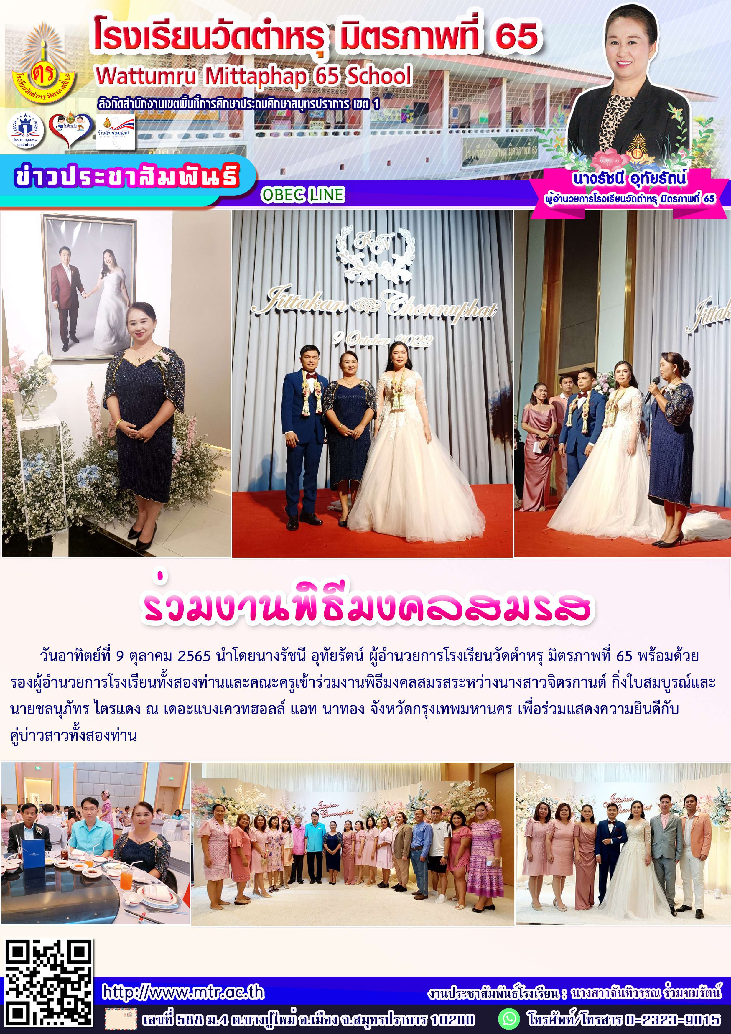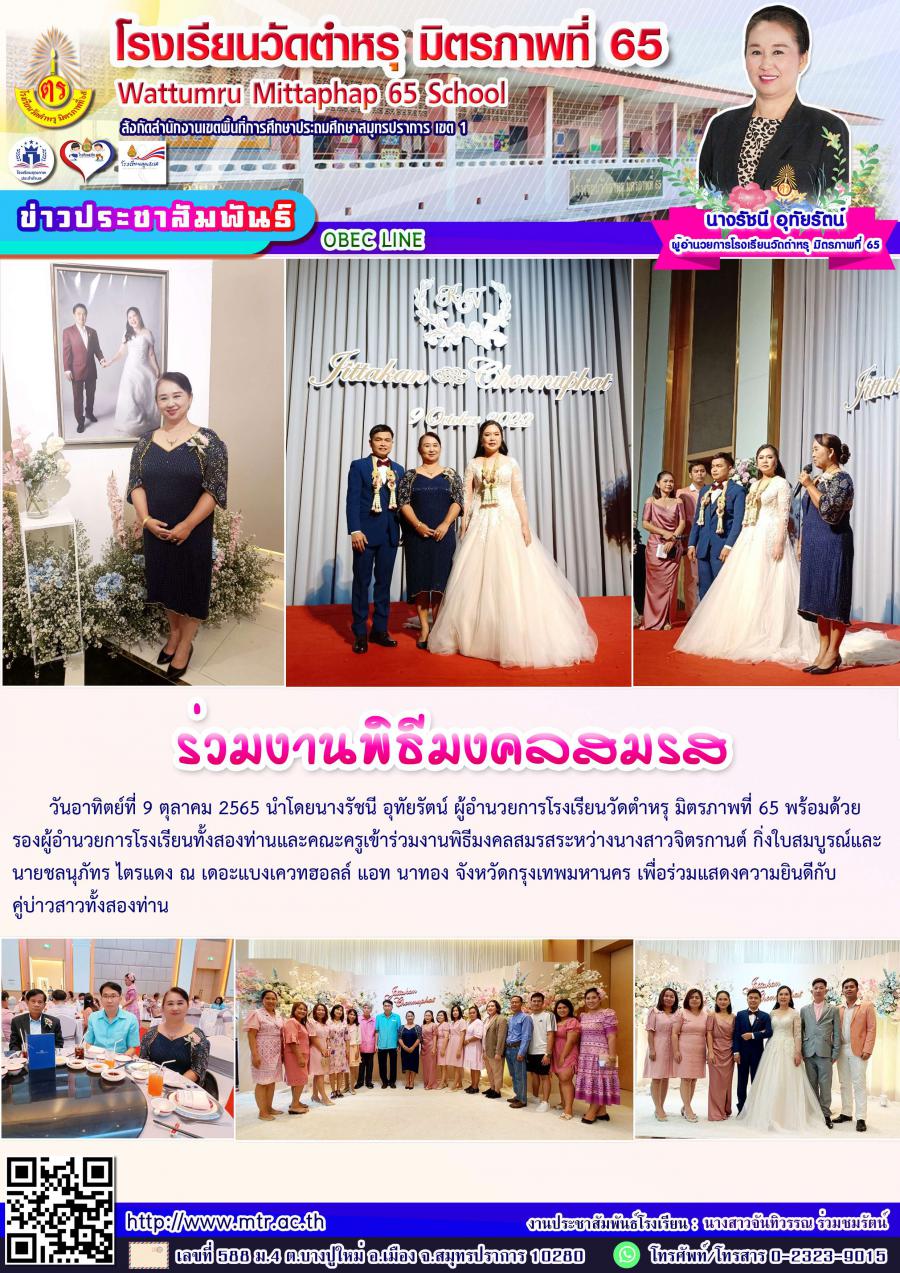 วันอาทิตย์ที่ 9 ตุลาคม 2565 นำโดยนางรัชนี อุทัยรัตน์ ผู้อำนวยการโรงเรียนวัดตำหรุ มิตรภาพที่ 65 พร้อมด้วยรองผู้อำนวยการโรงเรียนทั้งสองท่านและคณะครูเข้าร่วมงานพิธีมงคลสมรสระหว่างนางสาวจิตรกานต์ กิ่งใบสมบูรณ์และนายชลนุภัทร ไตรแดง ณ เดอะแบงเควทฮอลล์ แอท นาทอง จังหวัดกรุงเทพมหานคร เพื่อร่วมแสดงความยินดีกับคู่บ่าวสาวทั้งสองท่าน