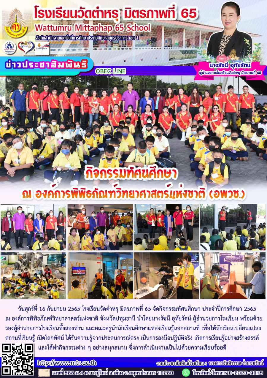 วันศุกร์ที่ 16 กันยายน 2565 โรงเรียนวัดตำหรุ มิตรภาพที่ 65 จัดกิจกรรมทัศนศึกษา ประจำปีการศึกษา 2565 ณ องค์การพิพิธภัณฑ์วิทยาศาสตร์แห่งชาติ จังหวัดปทุมธานี นำโดยนางรัชนี อุทัยรัตน์ ผู้อำนวยการโรงเรียน พร้อมด้วยรองผู้อำนวยการโรงเรียนทั้งสองท่าน และคณะครูนำนักเรียนศึกษาแหล่งเรียนรู้นอกสถานที่ เพื่อให้นักเรียนเปลี่ยนแปลงสถานที่เรียนรู้ เปิดโลกทัศน์ ได้รับความรู้จากประสบการณ์ตรง เป็นการลงมือปฏิบัติจริง เกิดการเรียนรู้อย่างสร้างสรรค์ และได้ทำกิจกรรมต่าง ๆ อย่างสนุกสนาน ซึ่งการดำเนินงานเป็นไปด้วยความเรียบร้อยดี