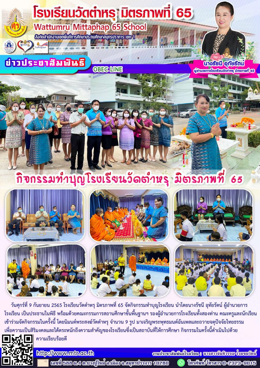 วันศุกร์ที่ 9 กันยายน 2565 โรงเรียนวัดตำหรุ มิตรภาพที่ 65 จัดกิจกรรมทำบุญโรงเรียน นำโดยนางรัชนี อุทัยรัตน์ ผู้อำนวยการโรงเรียน เป็นประธานในพิธี พร้อมด้วยคณะกรรมการสถานศึกษาขั้นพื้นฐานฯ รองผู้อำนวยการโรงเรียนทั้งสองท่าน คณะครูและนักเรียนเข้าร่วมจัดกิจกรรมในครั้งนี้ โดยนิมนต์พระสงฆ์วัดตำหรุ จำนวน 9 รูป มาเจริญพระพุทธมนต์ฉันเพลและถวายจตุปัจจัยไทยธรรม เพื่อความเป็นสิริมงคลและได้ตระหนักถึงความสำคัญของโรงเรียนซึ่งเป็นสถาบันที่ให้การศึกษา กิจกรรมในครั้งนี้ดำเนินไปด้วย ความเรียบร้อยดี