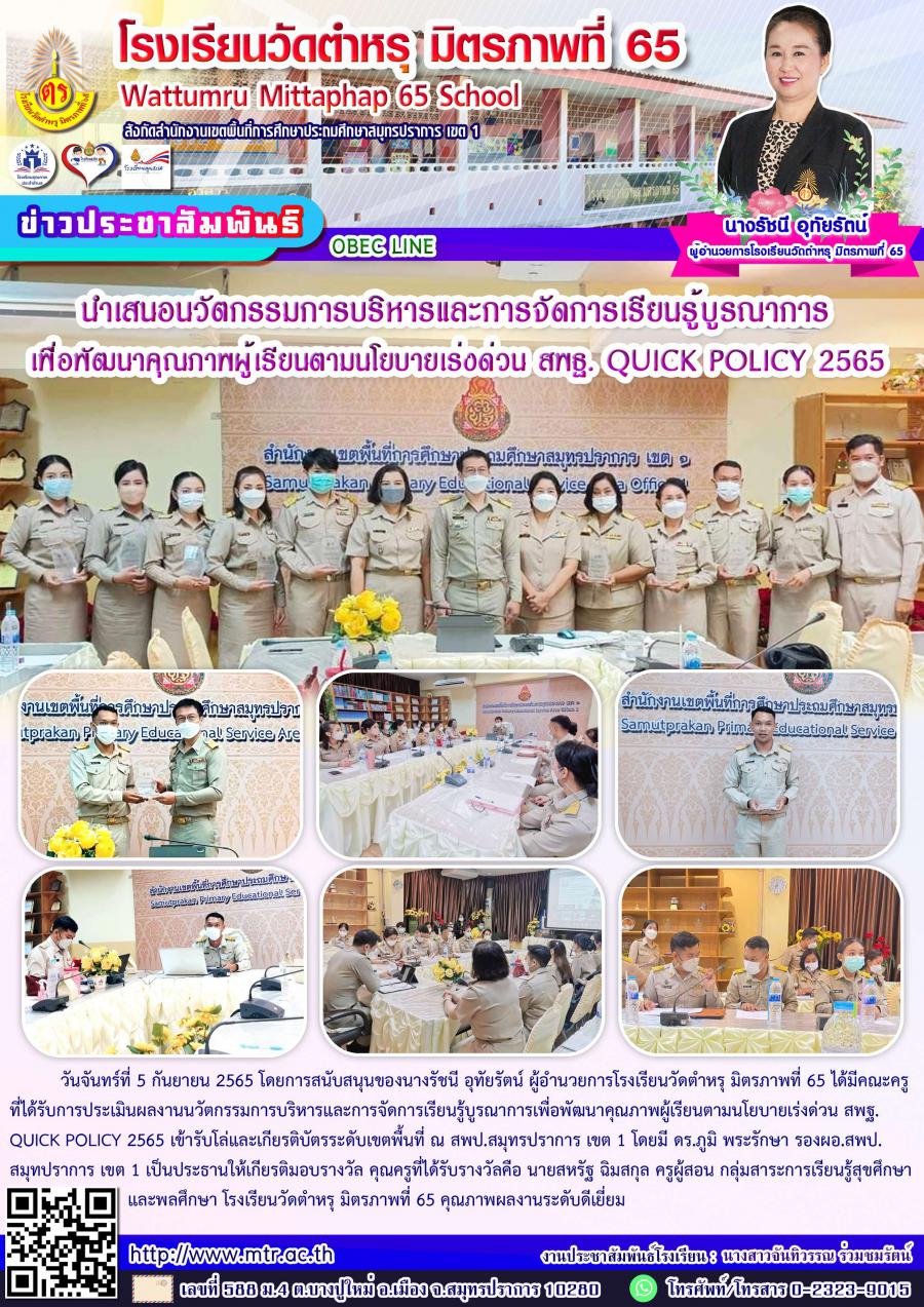วันจันทร์ที่ 5 กันยายน 2565 โดยการสนับสนุนของนางรัชนี อุทัยรัตน์ ผู้อำนวยการโรงเรียนวัดตำหรุ มิตรภาพที่ 65 ได้มีคณะครูที่ได้รับการประเมินผลงานนวัตกรรมการบริหารและการจัดการเรียนรู้บูรณาการเพื่อพัฒนาคุณภาพผู้เรียนตามนโยบายเร่งด่วน สพฐ. QUICK POLICY 2565 เข้ารับโล่และเกียรติบัตรระดับเขตพื้นที่ ณ  สพป.สมุทรปราการ เขต 1 โดยมี ดร.ภูมิ พระรักษา รองผอ.สพป.สมุทปราการ เขต 1 เป็นประธานให้เกียรติมอบรางวัล คุณครูที่ได้รับรางวัลคือ นายสหรัฐ ฉิมสกุล ครูผู้สอน กลุ่มสาระการเรียนรู้สุขศึกษาและพลศึกษา โรงเรียนวัดตำหรุ มิตรภาพที่ 65 คุณภาพผลงานระดับดีเยี่ยม