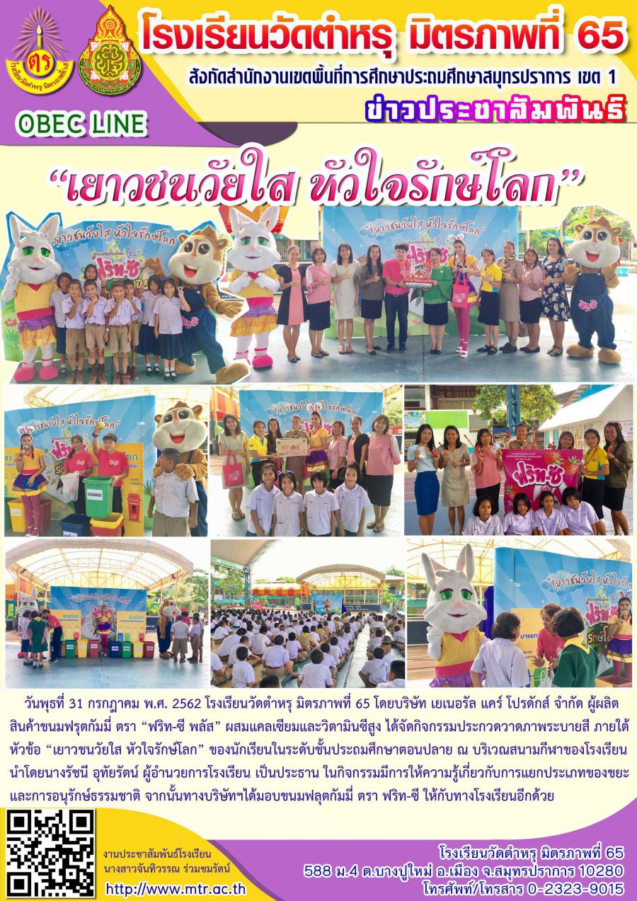 วันพุธที่ 31 กรกฎาคม พ.ศ. 2562 โรงเรียนวัดตำหรุ มิตรภาพที่ 65 โดยบริษัท เยเนอรัล แคร์ โปรดักส์ จำกัด ผู้ผลิตสินค้าขนมฟรุตกัมมี่ ตรา ?ฟริท-ซี พลัส? ผสมแคลเซียมและวิตามินซีสูง ได้จัดกิจกรรมประกวดวาดภาพระบายสี ภายใต้หัวข้อ ?เยาวชนวัยใส หัวใจรักษ์โลก? ของนักเรียนในระดับชั้นประถมศึกษาตอนปลาย ณ บริเวณสนามกีฬาของโรงเรียน นำโดยนางรัชนี อุทัยรัตน์ ผู้อำนวยการโรงเรียน เป็นประธาน ในกิจกรรมมีการให้ความรู้เกี่ยวกับการแยกประเภทของขยะและการอนุรักษ์ธรรมชาติ จากนั้นทางบริษัทฯได้มอบขนมฟลุตกัมมี่ ตรา ฟริท-ซี ให้กับทางโรงเรียนอีกด้วย