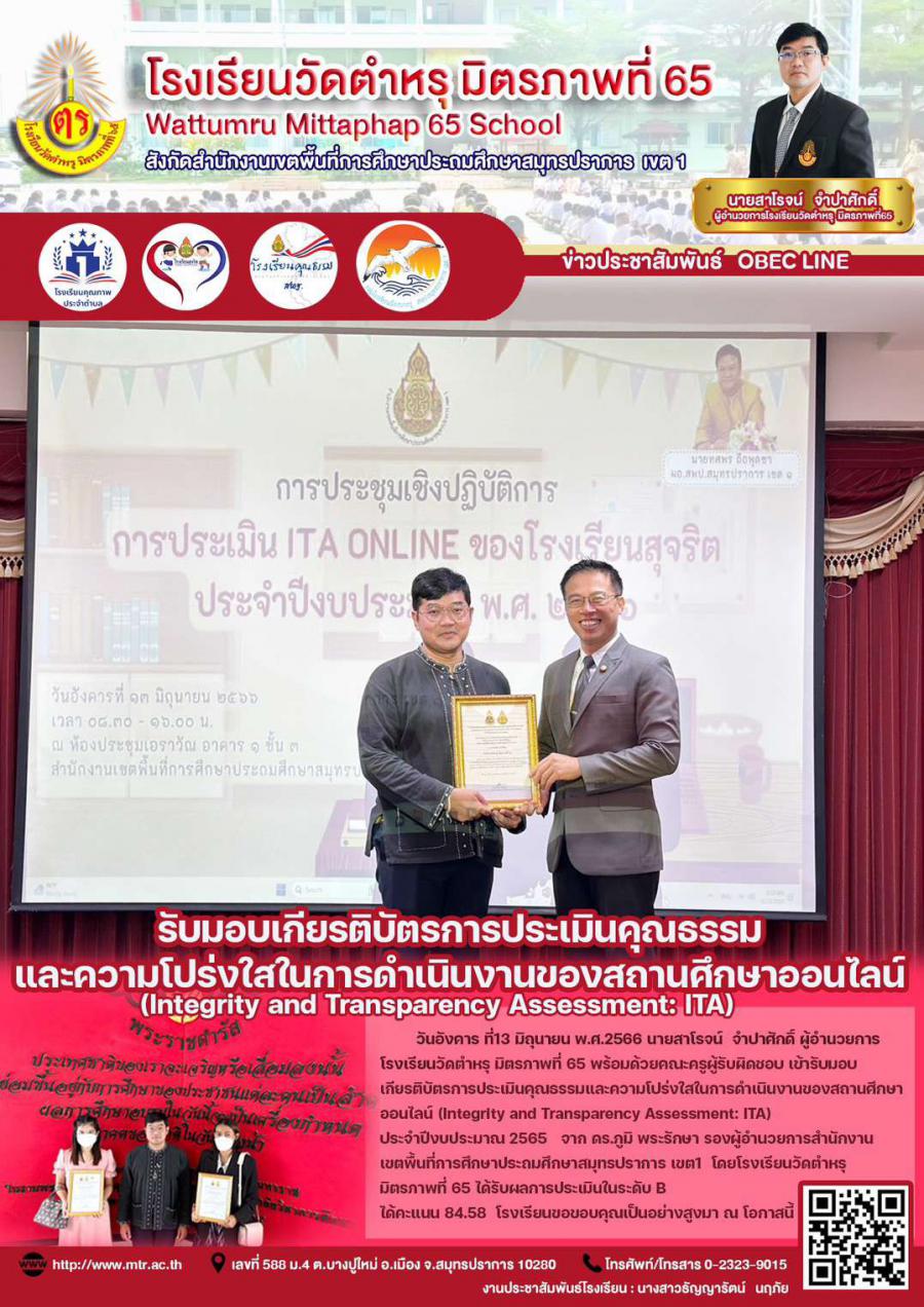 วันอังคาร ที่13 มิถุนายน พ.ศ.2566 นายสาโรจน์  จำปาศักดิ์ ผู้อำนวยการโรงเรียนวัดตำหรุ มิตรภาพที่ 65 พร้อมด้วยคณะครูผู้รับผิดชอบ เข้ารับมอบเกียรติบัตรการประเมินคุณธรรมและความโปร่งใสในการดำเนินงานของสถานศึกษาออนไลน์    (Integrity and Transparency Assessment: ITA) ประจำปีงบประมาณ 2565  จาก ดร.ภูมิ  พระรักษา รองผู้อำนวยการสำนักงานเขตพื้นที่การศึกษาประถมศึกษาสมุทรปราการ เขต1 โดยโรงเรียนวัดตำหรุ มิตรภาพที่ 65 ได้รับผลการประเมิน ในระดับ B ได้คะแนน 84.58  โรงเรียนขอขอบคุณเป็นอย่างสูงมา ณ โอกาสนี้