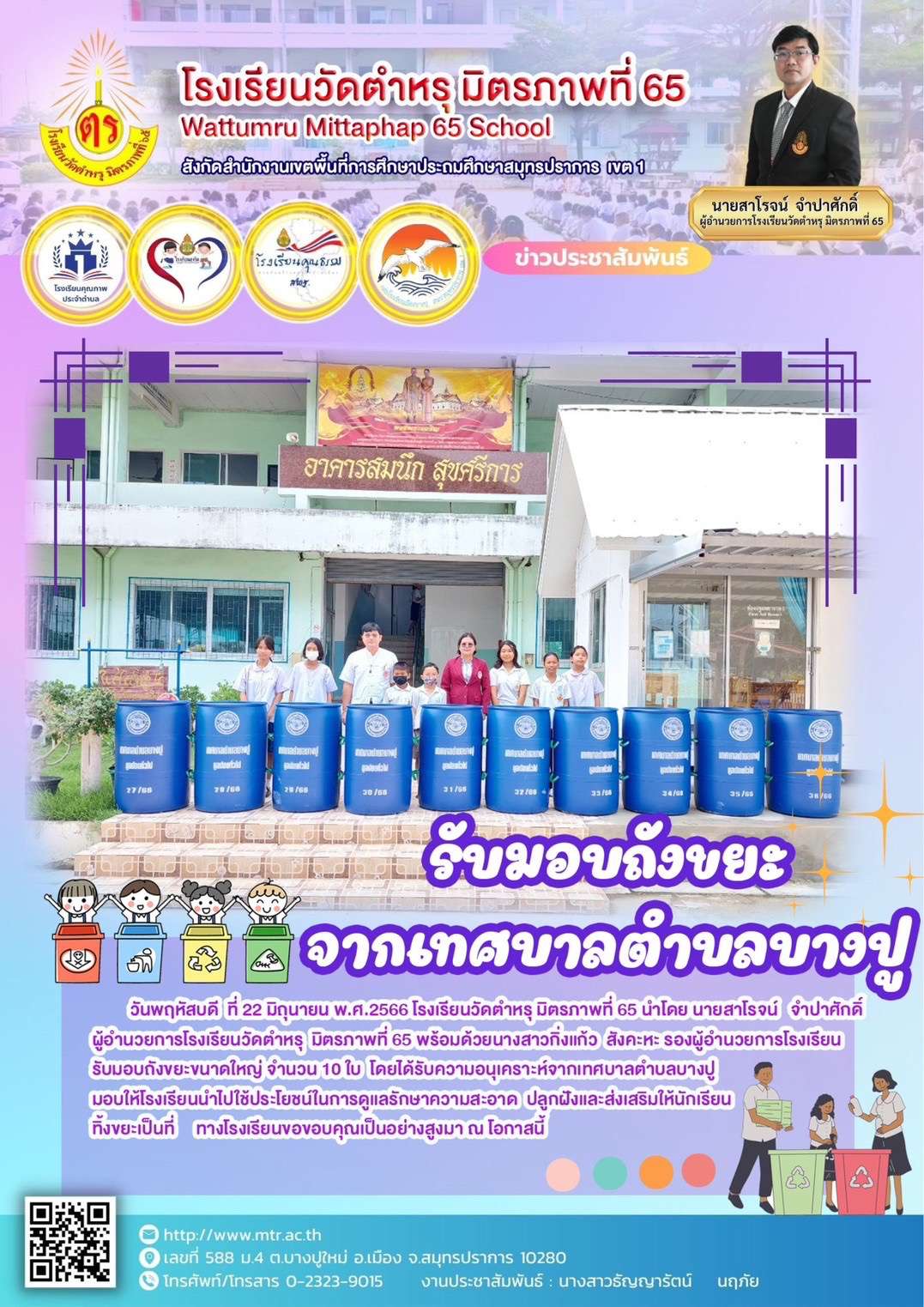 วันพฤหัสบดี  ที่ 22 มิถุนายน พ.ศ.2566 โรงเรียนวัดตำหรุ มิตรภาพที่ 65 นำโดย นายสาโรจน์   จำปาศักดิ์ ผู้อำนวยการโรงเรียนวัดตำหรุ  มิตรภาพที่ 65 พร้อมด้วยนางสาวกิ่งแก้ว  สังคะหะ รองผู้อำนวยการโรงเรียนรับมอบถังขยะขนาดใหญ่ จำนวน 10 ใบ  โดยได้รับความอนุเคราะห์จากเทศบาลตำบลบางปู มอบให้โรงเรียนนำไปใช้ประโยชน์ในการดูแลรักษาความสะอาด  ปลูกฝังและส่งเสริมให้นักเรียนทิ้งขยะเป็นที่ ทางโรงเรียนขอขอบคุณเป็นอย่างสูงมา ณ โอกาสนี้