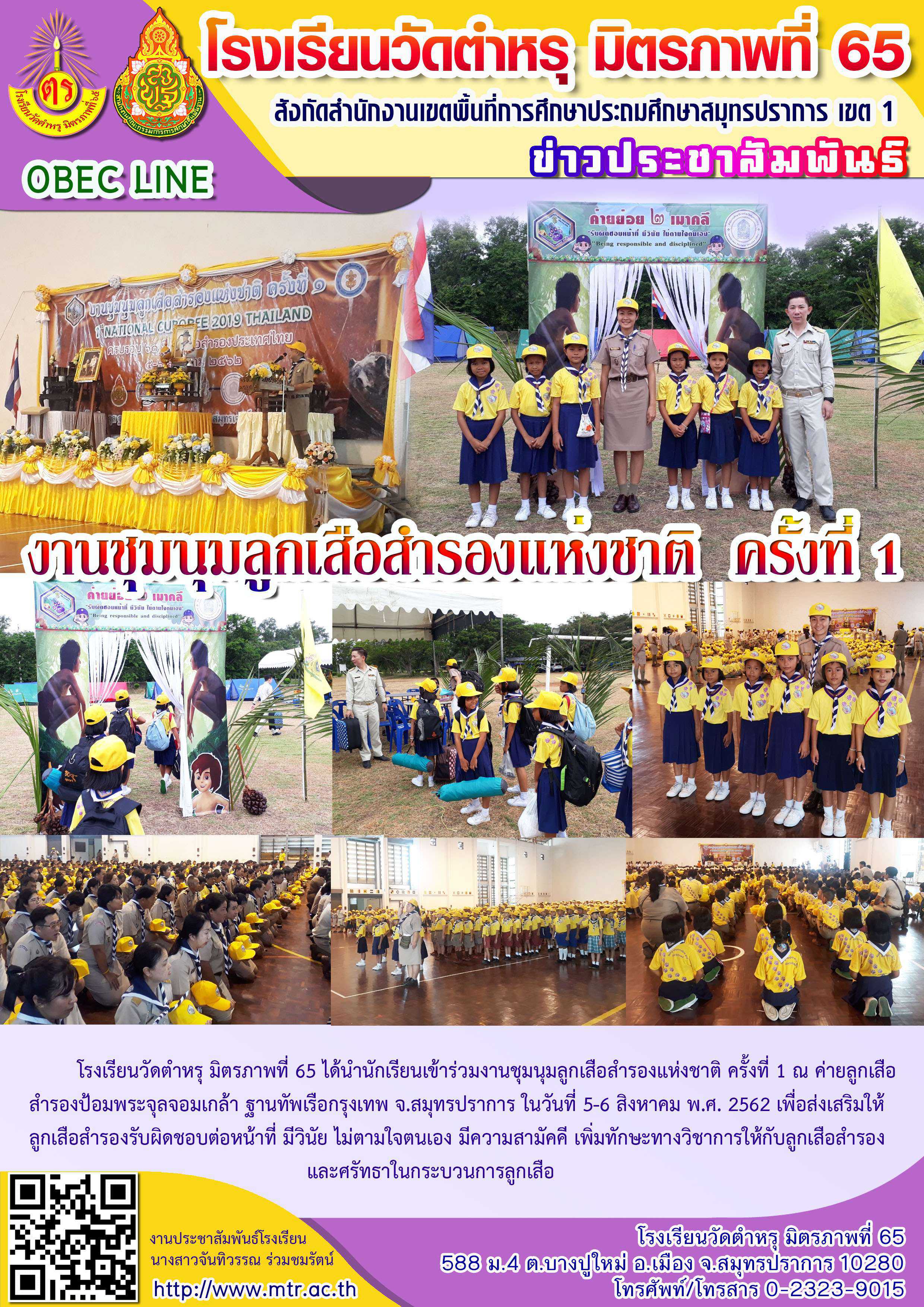 โรงเรียนวัดตำหรุ มิตรภาพที่ 65 ได้นำนักเรียนเข้าร่วมงานชุมนุมลูกเสือสำรองแห่งชาติ ครั้งที่ 1 ณ ค่ายลูกเสือสำรองป้อมพระจุลจอมเกล้า ฐานทัพเรือกรุงเทพ จ.สมุทรปราการ ในวันที่ 5-6 สิงหาคม พ.ศ. 2562 เพื่อส่งเสริมให้ลูกเสือสำรองรับผิดชอบต่อหน้าที่ มีวินัย ไม่ตามใจตนเอง มีความสามัคคี เพิ่มทักษะทางวิชาการให้กับลูกเสือสำรอง และศรัทธาในกระบวนการลูกเสือ