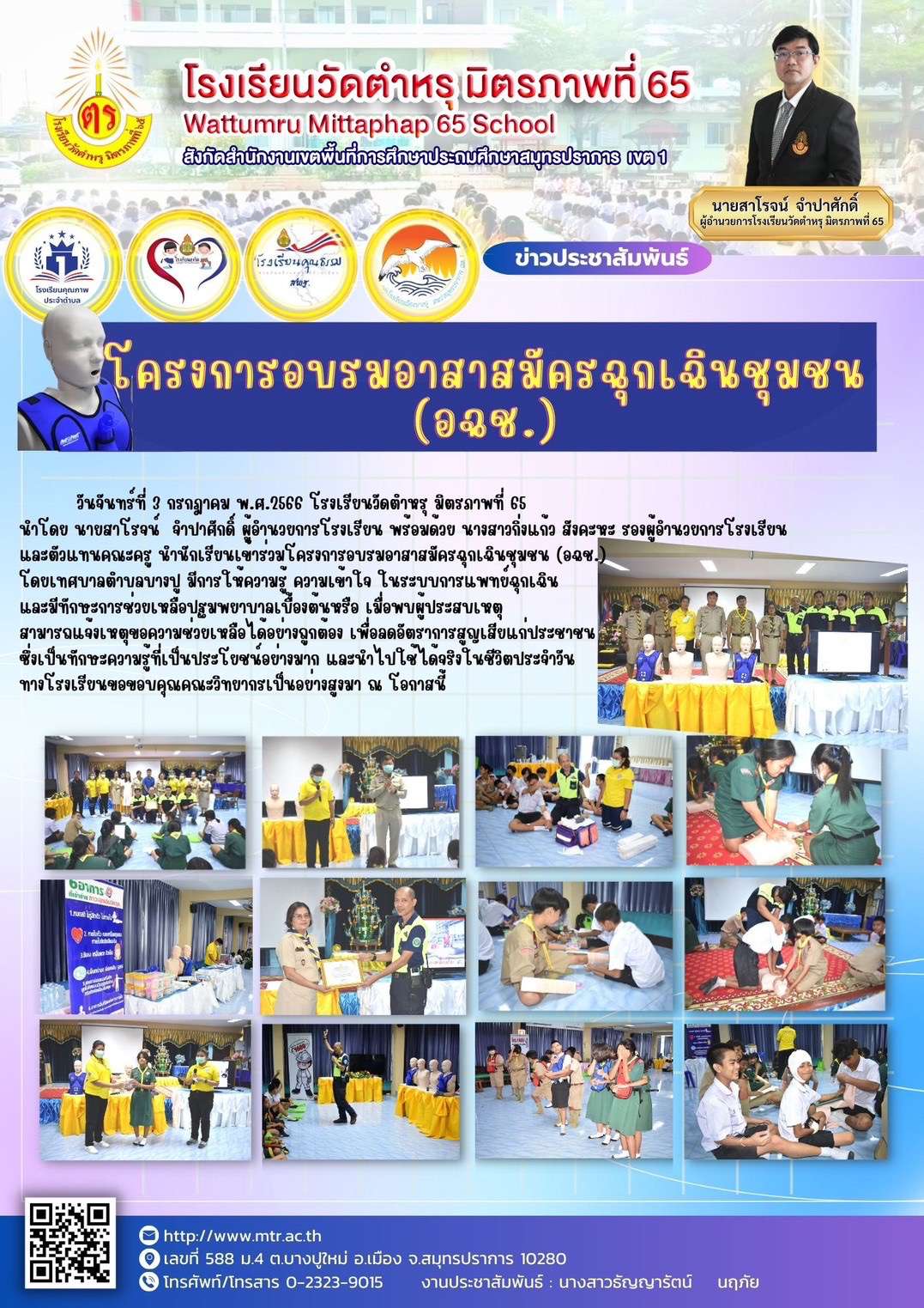 วันจันทร์ที่ 3 กรกฎาคม พ.ศ.2566 โรงเรียนวัดตำหรุ มิตรภาพที่ 65 นำโดย นายสาโรจน์  จำปาศักดิ์ ผู้อำนวยการโรงเรียน พร้อมด้วย นางสาวกิ่งแก้ว สังคะหะ รองผู้อำนวยการโรงเรียน และตัวแทนคณะครู นำนักเรียนเข้าร่วมโครงการอบรมอาสาสมัครฉุกเฉินชุมชน (อฉช.) โดยเทศบาลตำบลบางปู มีการให้ความรู้ ความเข้าใจ ในระบบการแพทย์ฉุกเฉิน และมีทักษะการช่วยเหลือปฐมพยาบาลเบื้องต้นหรือ เมื่อพบผู้ประสบเหตุสามารถแจ้งเหตุขอความช่วยเหลือได้อย่างถูกต้อง เพื่อลดอัตราการสูญเสียแก่ประชาชนซึ่งเป็นทักษะความรู้ที่เป็นประโยชน์อย่างมาก และนำไปใช้ได้จริงในชีวิตประจำวันทางโรงเรียนขอขอบคุณคณะวิทยากรเป็นอย่างสูงมา ณ โอกาสนี้