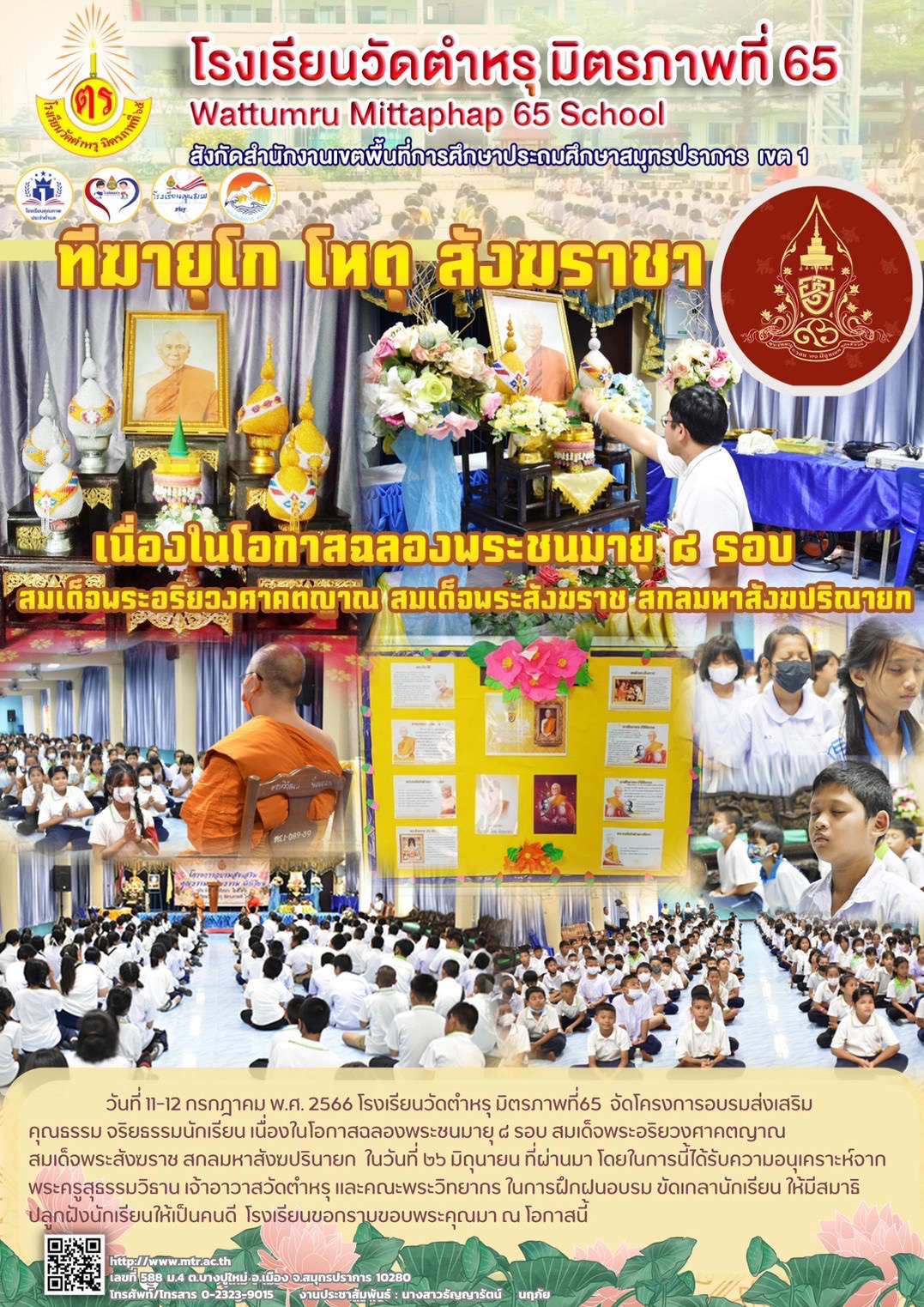 วันที่ ๑๑-๑๒ กรกฎาคม พ.ศ. ๒๕๖๖ โรงเรียนวัดตำหรุ มิตรภาพที่ ๖๕ จัดโครงการอบรมส่งเสริมคุณธรรม จริยธรรมนักเรียน เนื่องในโอกาสฉลองพระชนมายุ ๘ รอบ สมเด็จพระอริยวงศาคตญาณ สมเด็จพระสังฆราช สกลมหาสังฆปรินายก  ในวันที่ ๒๖ มิถุนายน ที่ผ่านมา โดยในการนี้ได้รับความอนุเคราะห์จากพระครูสุธรรมวิธาน เจ้าอาวาสวัดตำหรุ และคณะพระวิทยากร ในการฝึกฝนอบรม ขัดเกลานักเรียน ให้มีสมาธิปลูกฝังนักเรียนให้เป็นคนดี  โรงเรียนขอกราบขอบพระคุณมา ณ โอกาสนี้