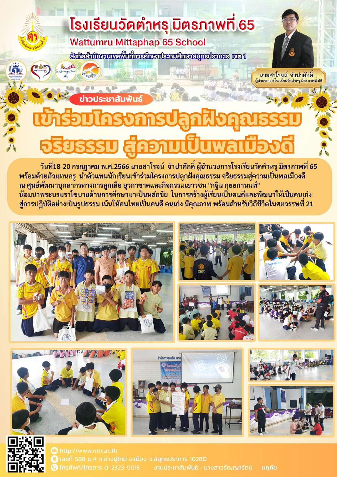 วันที่18-20 กรกฏาคม พ.ศ.2566 นายสาโรจน์  จำปาศักดิ์ ผู้อำนวยการโรงเรียนวัดตำหรุ มิตรภาพที่ 65  พร้อมด้วยตัวแทนครู  นำตัวแทนนักเรียนเข้าร่วมโครงการปลูกฝังคุณธรรม จริยธรรมสู่ความเป็นพลเมืองดี ณ ศูนย์พัฒนาบุคลากรทางการลูกเสือ ยุวกาชาดและกิจกรรมเยาวชน "กฐิน กุยยกานนท์" น้อมนำพระบรมราโชบายด้านการศึกษามาเป็นหลักชัย  ในการสร้างผู้เรียนเป็นคนดีและพัฒนาให้เป็นคนเก่งสู่การปฏิบัติอย่างเป็นรูปธรรม เน้นให้คนไทยเป็นคนดี คนเก่ง มีคุณภาพ พร้อมสำหรับวิถีชีวิตในศตวรรษที่ 21