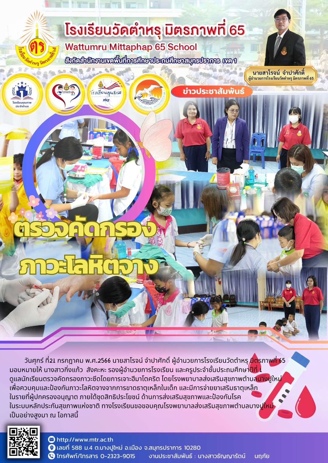 วันศุกร์ ที่21 กรกฎาคม พ.ศ.2566 นายสาโรจน์ จำปาศักดิ์ ผู้อำนวยการโรงเรียนวัดตำหรุ มิตรภาพที่ 65 มอบหมายให้ นางสาวกิ่งแก้ว  สังคะหะ รองผู้อำนวยการโรงเรียน และครูประจำชั้นประถมศึกษาปีที่ 1 ดูแลนักเรียนตรวจคัดกรองภาวะซีดโดยการเจาะฮีมาโตคริต โดยโรงพยาบาลส่งเสริมสุขภาพตำบลบางปูใหม่ เพื่อควบคุมและป้องกันภาวะโลหิตจางจากการขาดธาตุเหล็กในเด็ก และมีการจ่ายยาเสริมธาตุเหล็กในรายที่ผู้ปกครองอนุญาต ภายใต้ชุดสิทธิประโยชน์ ด้านการส่งเสริมสุขภาพและป้องกันโรค ในระบบหลักประกันสุขภาพแห่งชาติ ทางโรงเรียนขอขอบคุณโรงพยาบาลส่งเสริมสุขภาพตำบลบางปูใหม่เป็นอย่างสูงมา ณ โอกาสนี้