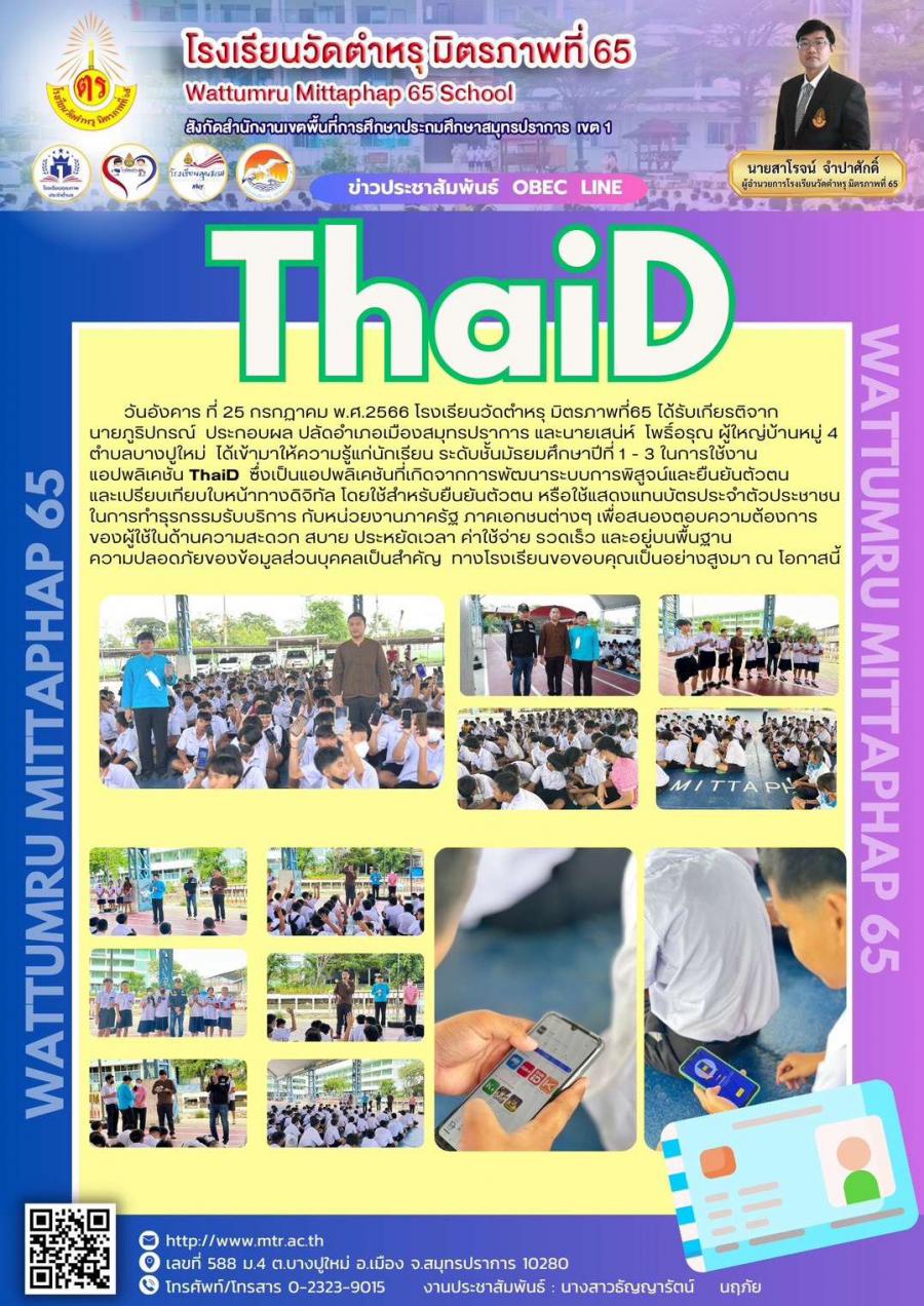 วันอังคาร ที่ 25 กรกฏาคม พ.ศ.2566 โรงเรียนวัดตำหรุ มิตรภาพที่65 ได้รับเกียรติจากนายภูริปกรณ์  ประกอบผล ปลัดอำเภอเมืองสมุทรปราการ และนายเสน่ห์  โพธิ์อรุณ ผู้ใหญ่บ้านหมู่ 4 ตำบลบางปูใหม่  ได้เข้ามาให้ความรู้แก่นักเรียน ระดับชั้นมัธยมศึกษาปีที่ 1 - 3 ในการใช้งานแอปพลิเคชัน ThaiD  ซึ่งเป็นแอปพลิเคชันที่เกิดจากการพัฒนาระบบการพิสูจน์และยืนยันตัวตน และเปรียบเทียบใบหน้าทางดิจิทัล โดยใช้สำหรับยืนยันตัวตน หรือใช้แสดงแทนบัตรประจำตัวประชาชน ในการทำธุรกรรมรับบริการ กับหน่วยงานภาครัฐ ภาคเอกชนต่างๆ เพื่อสนองตอบความต้องการของผู้ใช้ในด้านความสะดวก สบาย ประหยัดเวลา ค่าใช้จ่าย รวดเร็ว และอยู่บนพื้นฐานความปลอดภัยของข้อมูลส่วนบุคคลเป็นสำคัญ  ทางโรงเรียนขอขอบคุณเป็นอย่างสูงมา ณ โอกาสนี้ https://www.facebook.com/100057231168612/posts/pfbid033tpviHXEgMZ2GNFPb2JBDga9pfN9wBi83CCtZ8db26vkrjTHzfZHEYsmYVjzuen7l/