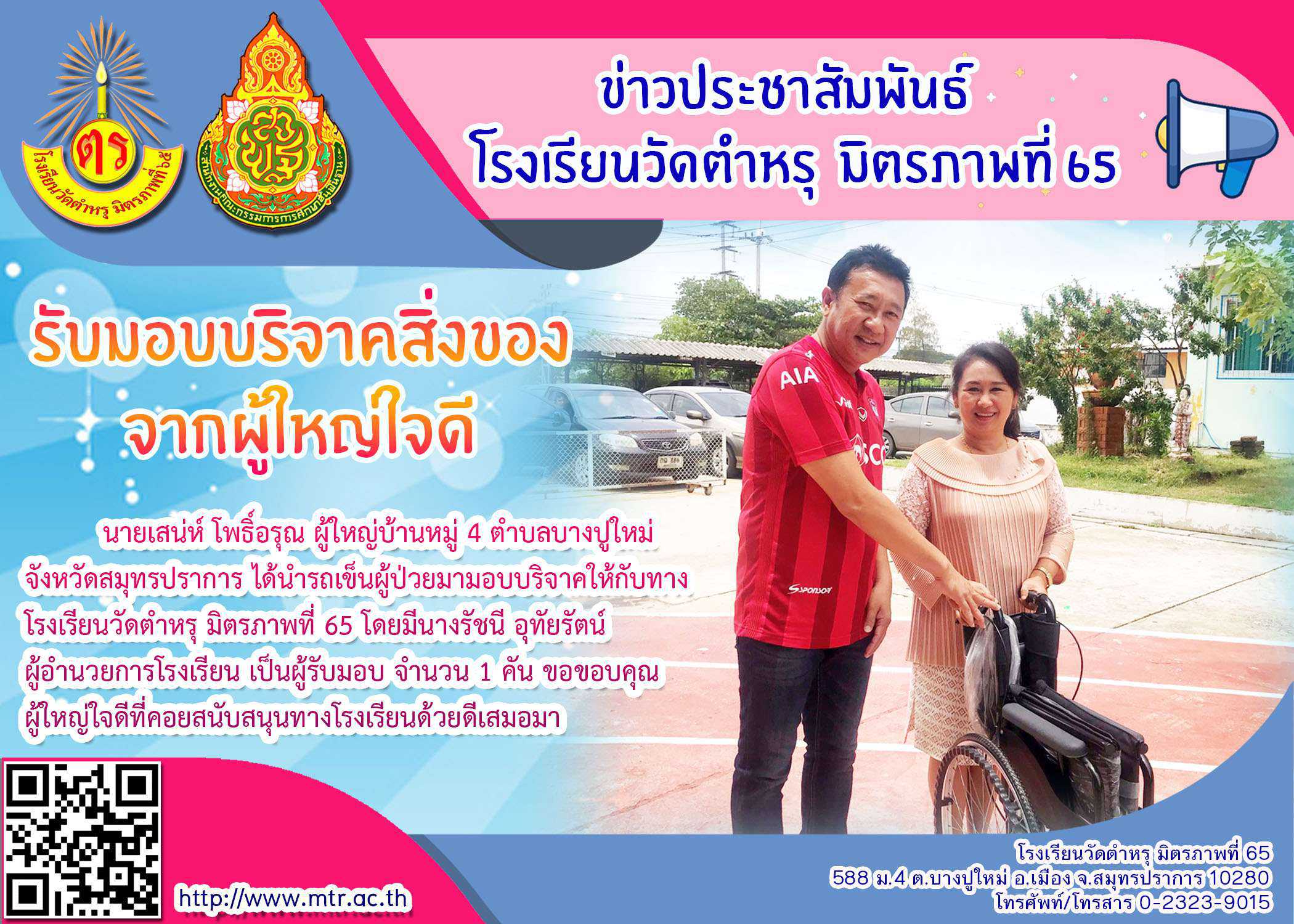 นายเสน่ห์ โพธิ์อรุณ ผู้ใหญ่บ้านหมู่ 4 ตำบลบางปูใหม่ จังหวัดสมุทรปราการ ได้มอบรถเข็นผู้ป่วยให้กับทางโรงเรียน จำนวน 1 คัน