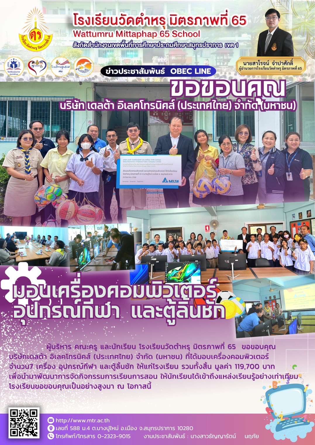 ขอบคุณ บริษัทเดลต้า อิเลคโทรนิคส์ (ประเทศไทย) จำกัด (มหาชน) ที่ได้มอบเครื่องคอมพิวเตอร์ จำนวน 7 เครื่อง อุปกรณ์กีฬา และตู้ลิ้นชัก