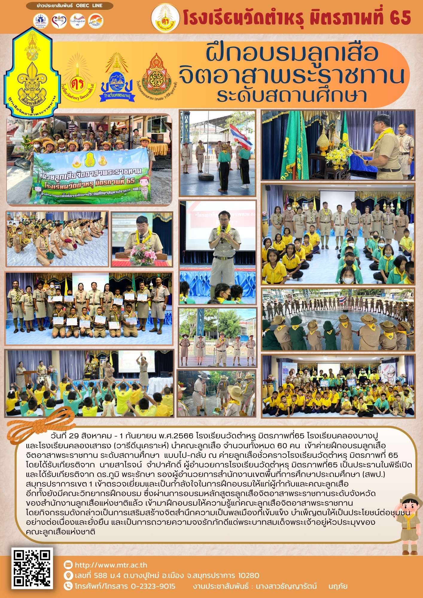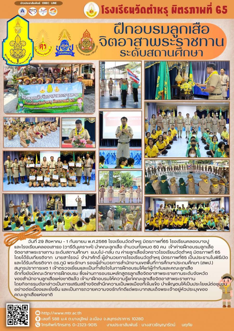 วันที่ 29 สิงหาคม - 1 กันยายน พ.ศ.2566 โรงเรียนวัดตำหรุ มิตรภาพที่65 โรงเรียนคลองบางปูและโรงเรียนคลองเสาธง (วารีดีนุเคราะห์) นำคณะลูกเสือ จำนวนทั้งหมด 60 คน  เข้าค่ายฝึกอบรมลูกเสือจิตอาสาพระราชทาน ระดับสถานศึกษา  แบบไป-กลับ ณ ค่ายลูกเสือชั่วคราวโรงเรียนวัดตำหรุ มิตรภาพที่ 65 โดยได้รับเกียรติจาก  นายสาโรจน์  จำปาศักดิ์ ผู้อำนวยการโรงเรียนวัดตำหรุ มิตรภาพที่65 เป็นประธานในพิธีเปิด และได้รับเกียรติจาก ดร.ภูมิ พระรักษา รองผู้อำนวยการสำนักงานเขตพื้นที่การศึกษาประถมศึกษา (สพป.) สมุทรปราการเขต 1 เข้าตรวจเยี่ยมและเป็นกำลังใจในการฝึกอบรมให้แก่ผู้กำกับและคณะลูกเสืออีกทั้งยังมีคณะวิทยากรฝึกอบรม ซึ่งผ่านการอบรมหลักสูตรลูกเสือจิตอาสาพระราชทานระดับจังหวัดของสำนักงานลูกเสือแห่งชาติแล้ว เข้ามาฝึกอบรมให้ความรู้แก่คณะลูกเสือจิตอาสาพระราชทาน