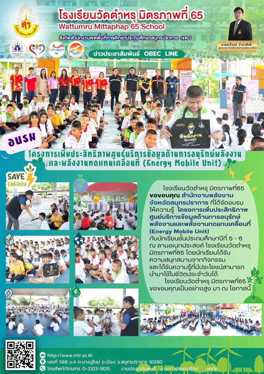 โรงเรียนวัดตำหรุ มิตรภาพที่65 ขอขอบคุณ สำนักงานพลังงานจังหวัดสมุทรปราการ ที่ได้จัดอบรมให้ความรู้ โครงการเพิ่มประสิทธิภาพศูนย์บริการข้อมูลด้านการอนุรักษ์พลังงานและพลังงานทดแทนเคลื่อนที่ (Energy Mobile Unit) กับนักเรียนชั้นประถมศึกษาปีที่ 5 - 6  ณ ลานอเนกประสงค์ โรงเรียนวัดตำหรุ มิตรภาพที่65 โดยนักเรียนได้รับความสนุกสนานจากกิจกรรมและได้รับความรู้ที่มีประโยชน์สามารถนำมาใช้ในชีวิตประจำวันได้ โรงเรียนวัดตำหรุ มิตรภาพที่65 ขอขอบคุณเป็นอย่างสูง มา ณ โอกาสนี้