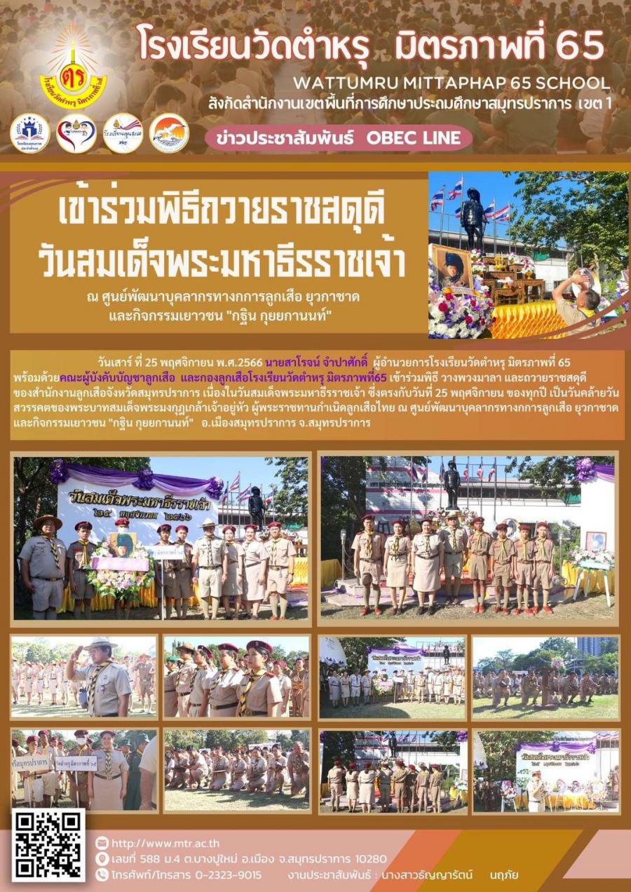 วันเสาร์ ที่ 25 พฤศจิกายน พ.ศ.2566 นายสาโรจน์ จำปาศักดิ์  ผู้อำนวยการโรงเรียนวัดตำหรุ มิตรภาพที่ 65 พร้อมด้วยคณะผู้บังคับบัญชาลูกเสือ  และกองลูกเสือโรงเรียนวัดตำหรุ มิตรภาพที่65 เข้าร่วมพิธี วางพวงมาลาและถวายราชสดุดีของสำนักงานลูกเสือจังหวัดสมุทรปราการ เนื่องในวันสมเด็จพระมหาธีรราชเจ้า ซึ่งตรงกับวันที่ 25 พฤศจิกายน ของทุกปี เป็นวันคล้ายวันสวรรคตของพระบาทสมเด็จพระมงกุฎเกล้าเจ้าอยู่หัว ผู้พระราชทานกำเนิดลูกเสือไทย ณ ศูนย์พัฒนาบุคลากรทางกการลูกเสือ ยุวกาชาด และกิจกรรมเยาวชน "กฐิน กุยยกานนท์"   อ.เมืองสมุทรปราการ จ.สมุทรปราการ https://www.facebook.com/100057231168612/posts/pfbid0237aMgHyCjL6njWJ17ij5nqztA2M17d59v3HLojjeKRBW62rywbAeTha1o2cQx9hYl/