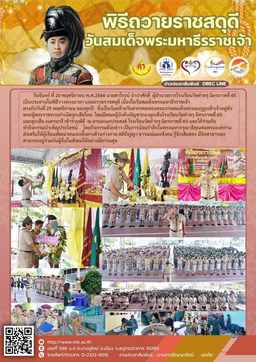 วันจันทร์ ที่ 20 พฤศจิกายน พ.ศ.2566 นายสาโรจน์ จำปาศักดิ์ ผู้อำนวยการโรงเรียนวัดตำหรุ มิตรภาพที่ 65 เป็นประธานในพิธีวางพวงมาลา และถวายราชสดุดี เนื่องในวันสมเด็จพระมหาธีรราชเจ้า ตรงกับวันที่ 25 พฤศจิกายน ของทุกปี ซึ่งเป็นวันคล้ายวันสรรคตของพระบาทสมเด็จพระมงกุฎเกล้าเจ้าอยู่หัว พระผู้พระราชทานกำเนิดลูกเสือไทย โดยมีคณะผู้บังคับบัญชากองลูกเสือโรงเรียนวัดตำหรุ มิตรภาพที่ 65 และลูกเสือ-เนตรนารี เข้าร่วมพิธี ณ ลานอเนกประสงค์ โรงเรียนวัดตำหรุ มิตรภาพที่ 65 และได้ร่วมกันทำกิจกรรมบำเพ็ญประโยชน์โดยกิจกรรมดังกล่าว เป็นการน้อมรำลึกในพระมหากรุณาธิคุณต่อพระองค์ท่าน ส่งเสริมให้ผู้เรียนพัฒนาตนเองทั้งทางด้านร่างกาย สติปัญญา ารมณ์และสังคม รู้จักเสียสละ มีจิตสาธารณะ สามารถอยู่ร่วมกับผู้อื่นในสังคมได้อย่างมีความสุข