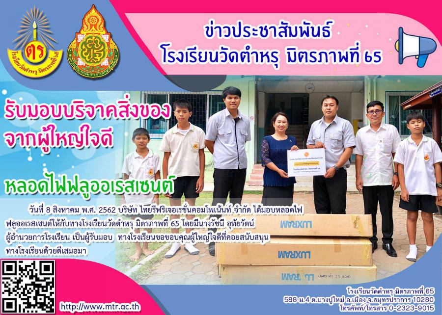 วันที่ 8 สิงหาคม พ.ศ.2562 บริษัท ไทยรีฟริเจอเรชั่นคอมโพเน้นท์ จำกัด ได้มอบหลอดไฟฟลูออเรสเซนต์ให้กับทางโรงเรียน