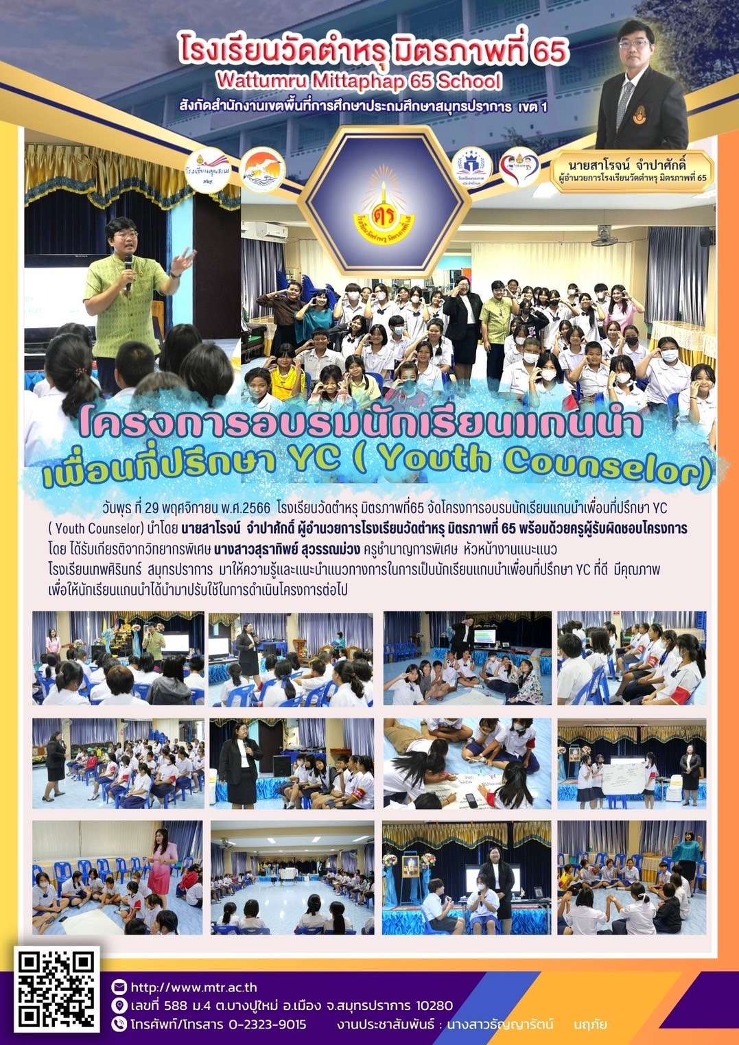 วันพุธ ที่ 29 พฤศจิกายน พ.ศ.2566  โรงเรียนวัดตำหรุ มิตรภาพที่65 จัดโครงการอบรมนักเรียนแกนนำเพื่อนที่ปรึกษา YC ( Youth Counselor) นำโดย นายสาโรจน์  จำปาศักดิ์ ผู้อำนวยการโรงเรียนวัดตำหรุ มิตรภาพที่ 65 พร้อมด้วยครูผู้รับผิดชอบโครงการ โดย ได้รับเกียรติจากวิทยากรพิเศษ นางสาวสุธาทิพย์ สุวรรณม่วง ครูชำนาญการพิเศษ  หัวหน้างานแนะแนว โรงเรียนเทพศิรินทร์  สมุทรปราการ มาให้ความรู้และแนะนำแนวทางการในการเป็นนักเรียนแกนนำเพื่อนที่ปรึกษา YC ที่ดี  มีคุณภาพ เพื่อให้นักเรียนแกนนำได้นำมาปรับใช้ในการดำเนินโครงการต่อไปhttps://www.facebook.com/100057231168612/posts/pfbid02yEiHKUzPJXjv3uBmnaaBM33vv9nAzKawYW992HAUUZjt3t2H83wrereimmsQzGjfl/