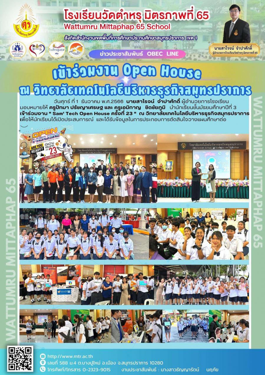 วันศุกร์ ที่ 1 ธันวาคม พ.ศ.2566 นายสาโรจน์ จำปาศักดิ์ ผู้อำนวยการโรงเรียน มอบหมายให้ ครูปัทมา ปรัชญาเศรษฐ และ ครูเอมิกาญ ชิดชัยภูมิ นำนักเรียนชั้นมัธยมศึกษาปีที่ 3 เข้าร่วมงาน " Sam' Tech Open House ครั้งที่ 23 " ณ วิทยาลัยเทคโนโลยีบริหารธุรกิจสมุทรปราการ เพื่อให้นักเรียนได้เปิดประสบการณ์และได้รับข้อมูลในการประกอบการตัดสินใจวางแผนศึกษาต่อ