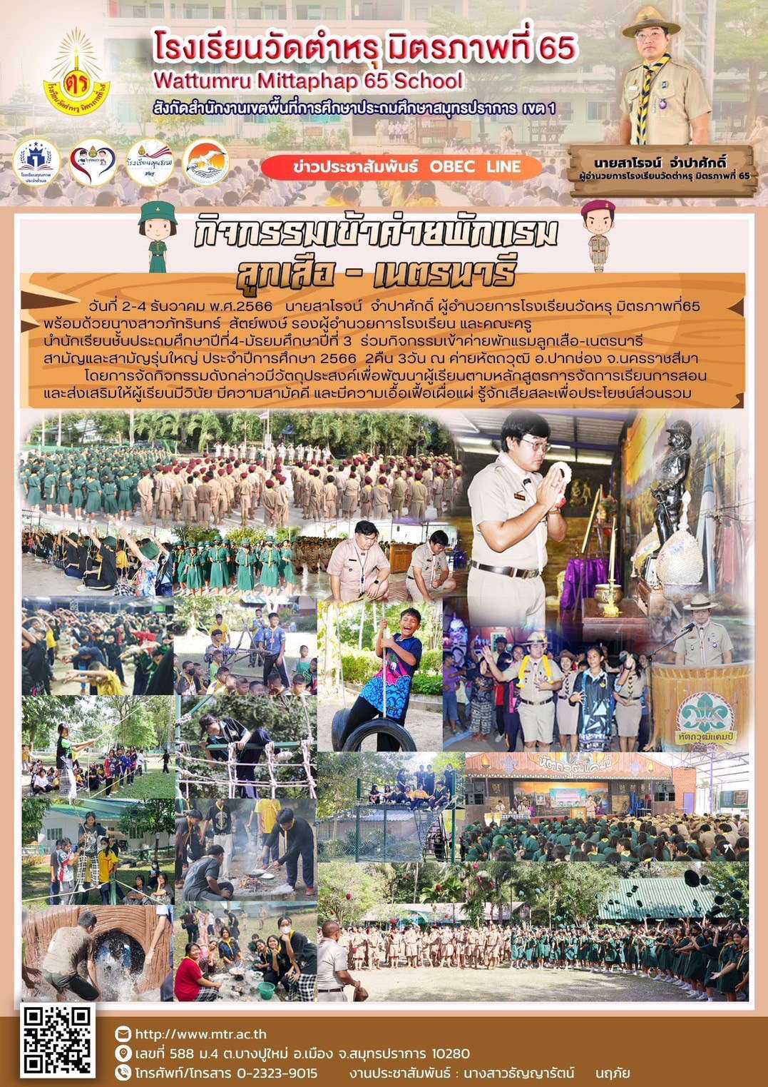 วันที่ 2-4 ธันวาคม พ.ศ.2566   นายสาโรจน์  จำปาศักดิ์ ผู้อำนวยการโรงเรียนวัดหรุ มิตรภาพที่ 65 พร้อมด้วยนางสาวภัทรินทร์  สัตย์พงษ์ รองผู้อำนวยการโรงเรียน และคณะครู นำนักเรียนชั้นประถมศึกษาปีที่4 ถึง มัธยมศึกษาปีที่ 3  ร่วมกิจกรรมเข้าค่ายพักแรมลูกเสือ-เนตรนารี สามัญและสามัญรุ่นใหญ่ ประจำปีการศึกษา 2566  2คืน 3วัน ณ ค่ายหัตถวุฒิ อ.ปากช่อง จ.นครราชสีมา โดยการจัดกิจกรรมดังกล่าวมีวัตถุประสงค์เพื่อพัฒนาผู้เรียนตามหลักสูตรการจัดการเรียนการสอน และส่งเสริมให้ผู้เรียนมีวินัย มีความสามัคคี และมีความเอื้อเฟื้อเผื่อแผ่ รู้จักเสียสละเพื่อประโยชน์ส่วนรวม