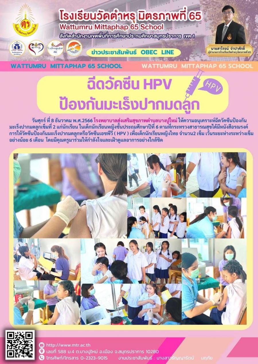 วันศุกร์ ที่ 8 ธันวาคม พ.ศ.2566 โรงพยาบาลส่งเสริมสุขภาพตำบลบางปูใหม่ ให้ความอนุเคราะห์ฉีดวัคซีนป้องกันมะเร็งปากมดลูกเข็มที่ 2 แก่นักเรียน ในเด็กนักเรียนหญิงชั้นประถมศึกษาปีที่ 6 ตามที่กระทรวงสาธารณสุขได้มีหนังสือรณรงค์การให้วัคซีนป้องกันมะเร็งปากมดลูกหรือวัคซีนเอชพีวี ( HPV ) เพื่อเด็กนักเรียนหญิงไทย จำนวน2 เข็ม เว้นระยะห่างระหว่างเข็มอย่างน้อย 6 เดือน  โดยมีคุณครูมาร่วมให้กำลังใจและเฝ้าดูแลอาการอย่างใกล้ชิดhttps://www.facebook.com/100057231168612/posts/pfbid034SnwNtGDFGmpTb3omFp3gh5iyeXoPNuHRreoahLAH42MLUH5H7ATD7cV7DduhxJHl/?