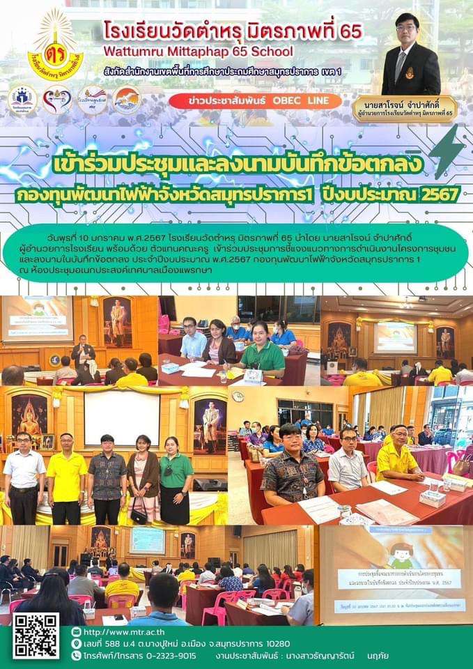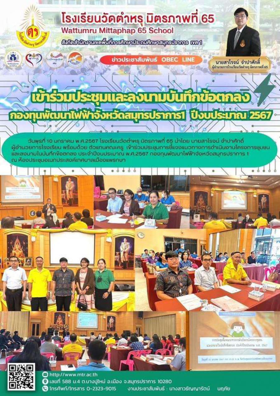 วันพุธที่ 10 มกราคม พ.ศ.2567 โรงเรียนวัดตำหรุ มิตรภาพที่ 65 นำโดย นายสาโรจน์ จำปาศักดิ์ ผู้อำนวยการโรงเรียน พร้อมด้วย ตัวแทนคณะครู  เข้าร่วมประชุมการชี้แจงแนวทางการดำเนินงานโครงการชุมชนและลงนามในบันทึกข้อตกลง ประจำปีงบประมาณ พ.ศ.2567 กองทุนพัฒนาไฟฟ้าจังหวัดสมุทรปราการ 1 ณ ห้องประชุมอเนกประสงค์เทศบาลเมืองแพรกษา https://www.facebook.com/100057231168612/posts/pfbid02mRffScKCQs3xwR3UwX3DGqRH6BNC53hUmvYCgxyGHbNCarPEuwEBjpesQD2Uk2XNl/?