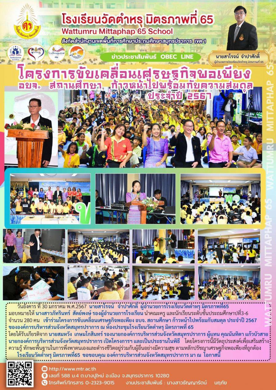 วันอังคาร ที่ 30 มกราคม พ.ศ.2567  นายสาโรจน์   จำปาศักดิ์  ผู้อำนวยการโรงเรียนวัดตำหรุ มิตรภาพที่65  มอบหมายให้ นางสาวภัทรินทร์  สัตย์พงษ์ รองผู้อำนวยการโรงเรียน นำคณะครู และนักเรียนระดับชั้นประถมศึกษาปีที่ 3-6 จำนวน 280 คน   เข้าร่วมโครงการขับเคลื่อนเศรษฐกิจพอเพียง อบจ. สถานศึกษา ก้าวหน้าไปพร้อมกับสมดุล ประจำปี 2567 ขององค์การบริหารส่วนจังหวัดสมุทรปราการ ณ ห้องประชุมโรงเรียนวัดตำหรุ มิตรภาพที่ 65 โดยได้รับเกียรติจาก นายสมหวัง  เกษมโกสินทร์ รองนายกองค์การบริหารส่วนจังหวัดสมุทรปราการ ผู้แทน คุณนันทิดา แก้วบัวสาย นายกองค์การบริหารส่วนจังหวัดสมุทรปราการ เปิดโครงการฯ และเป็นประธานในพิธี    โดยโครงการนี้มีวัตถุประสงค์เพื่อเสริมสร้างความรู้ ทักษะพื้นฐานในการพึ่งพาตนเองและดำรงชีวิตอยู่ร่วมกับผู้อื่นอย่างมีความสุข ตามหลักปรัชญาเศรษฐกิจพอเพียงที่ถูกต้อง โรงเรียนวัดตำหรุ มิตรภาพที่65  ขอขอบคุณ องค์การบริหารส่วนจังหวัดสมุทรปราการ มา ณ  โอกาสนี้ https://www.facebook.com/100057231168612/posts/pfbid0GAn5RiT2jmP4Rg2ZGq2zeLoTbAo8RAkXSuRkuHHvLvD1TiPH2HmyXQuPVDAkG5kFl/?