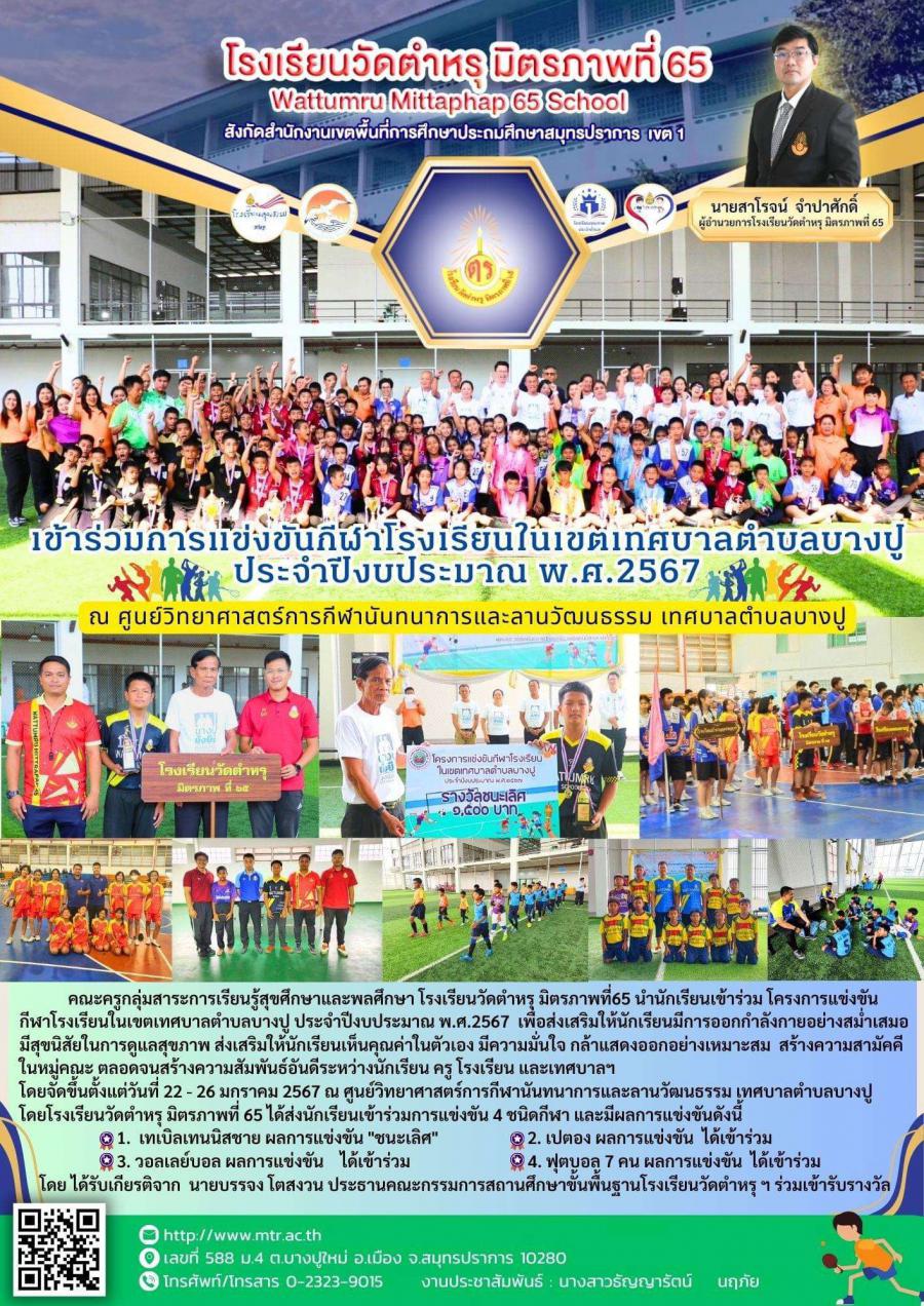 คณะครูกลุ่มสาระการเรียนรู้สุขศึกษาและพลศึกษา โรงเรียนวัดตำหรุ มิตรภาพที่65 นำนักเรียนเข้าร่วม โครงการแข่งขันกีฬาโรงเรียนในเขตเทศบาลตำบลบางปู ประจำปีงบประมาณ พ.ศ.2567  เพื่อส่งเสริมให้นักเรียนมีการออกกำลังกายอย่างสม่ำเสมอ มีสุขนิสัยในการดูแลสุขภาพ ส่งเสริมให้นักเรียนเห็นคุณค่าในตัวเอง มีความมั่นใจ กล้าแสดงออกอย่างเหมาะสม  สร้างความสามัคคีในหมู่คณะตลอดจนสร้างความสัมพันธ์อันดีระหว่างนักเรียน ครู โรงเรียน และเทศบาลฯ โดยจัดขึ้นตั้งแต่วันที่ 22 - 26 มกราคม 2567 ณ ศูนย์วิทยาศาสตร์การกีฬานันทนาการและลานวัฒนธรรม เทศบาลตำบลบางปู โดยโรงเรียนวัดตำหรุ มิตรภาพที่ 65 ได้ส่งนักเรียนเข้าร่วมการแข่งขัน 4 ชนิดกีฬา และมีผลการแข่งขันดังนี้