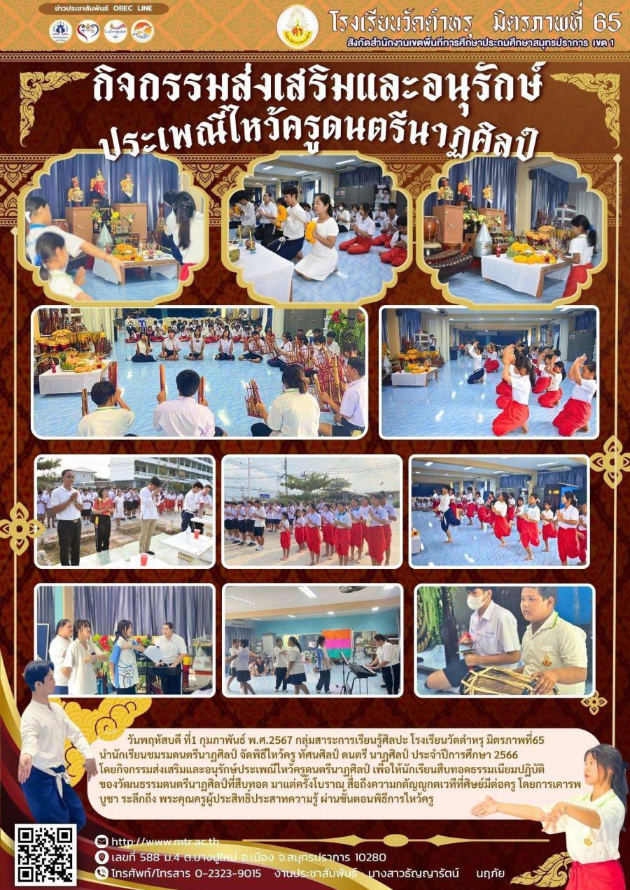 วันพฤหัสบดี ที่ 1 กุมภาพันธ์ พ.ศ.2567 กลุ่มสาระการเรียนรู้ศิลปะ โรงเรียนวัดตำหรุ มิตรภาพที่ 65 นำนักเรียนชมรมดนตรีนาฏศิลป์ จัดพิธีไหว้ครู ทัศนศิลป์ ดนตรี นาฏศิลป์ ประจำปีการศึกษา 2566 โดยกิจกรรมส่งเสริมและอนุรักษ์ประเพณีไหว้ครูดนตรีนาฏศิลป์ เพื่อให้นักเรียนสืบทอดธรรมเนียมปฏิบัติของวัฒนธรรมดนตรีนาฏศิลป์ที่สืบทอด มาแต่ครั้งโบราณ สื่อถึงความกตัญญูกตเวทีที่ศิษย์มีต่อครู โดยการเคารพบูชา ระลึกถึง พระคุณครูผู้ประสิทธิ์ประสาทความรู้ ผ่านขั้นตอนพิธีการไหว้ครู https://www.facebook.com/100057231168612/posts/pfbid02BAiSfScZQ3KCaG2w9XZ3ApD8AvjRCsbsqWL4YPPmpoW8SEUiHD5gPMNLCTz1iZBNl/?
