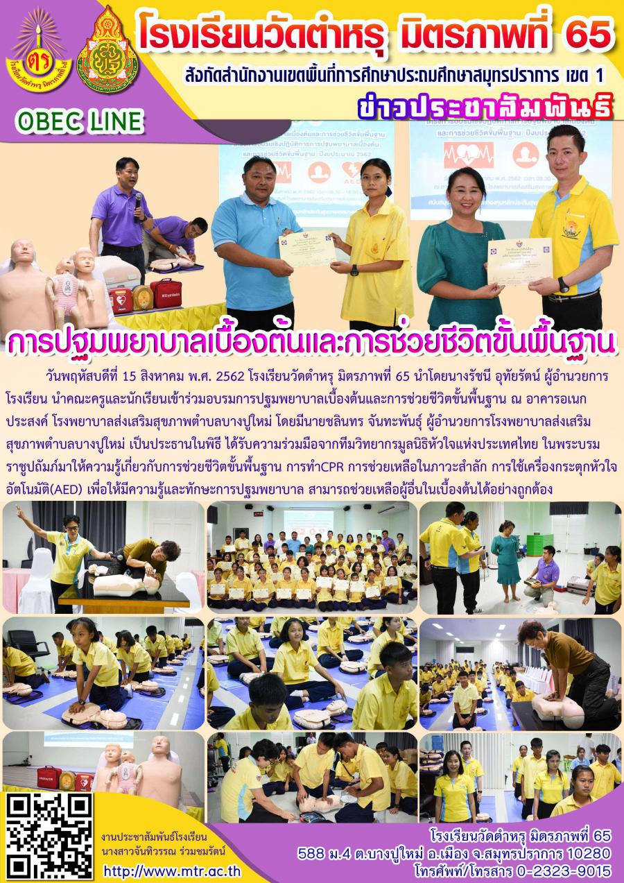 วันพฤหัสบดีที่ 15 สิงหาคม พ.ศ. 2562 โรงเรียนวัดตำหรุ มิตรภาพที่ 65 นำโดยนางรัชนี อุทัยรัตน์ ผู้อำนวยการ โรงเรียน นำคณะครูและนักเรียนเข้าร่วมอบรมการปฐมพยาบาลเบื้องต้นและการช่วยชีวิตขั้นพื้นฐาน ณ อาคารอเนก ประสงค์ โรงพยาบาลส่งเสริมสุขภาพตำบลบางปูใหม่ โดยมีนายชลินทร จันทะพันธุ์ ผู้อำนวยการโรงพยาบาลส่งเสริม สุขภาพตำบลบางปูใหม่ เป็นประธานในพิธี ได้รับความร่วมมือจากทีมวิทยากรมูลนิธิหัวใจแห่งประเทศไทย ในพระบรม ราชูปถัมภ์มาให้ความรู้เกี่ยวกับการช่วยชีวิตขั้นพื้นฐาน การทำCPR การช่วยเหลือในภาวะสำลัก การใช้เครื่องกระตุกหัวใจ อัตโนมัติ(AED) เพื่อให้มีความรู้และทักษะการปฐมพยาบาล สามารถช่วยเหลือผู้อื่นในเบื้องต้นได้อย่างถูกต้อง