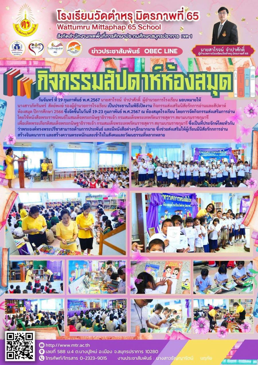 วันจันทร์ ที่ 19 กุมภาพันธ์ พ.ศ.2567 นายสาโรจน์ จำปาศักดิ์ ผู้อำนวยการโรงเรียน มอบหมายให้นางสาวภัทรินทร์ สัตย์พงษ์ รองผู้อำนวยการโรงเรียน เป็นประธานในพิธีเปิดงาน กิจกรรมส่งเสริมนิสัยรักการอ่านและสัปดาห์ห้องสมุด ปีการศึกษา 2566 ซึ่งจัดขึ้นในวันที่ 19-23 กุมภาพันธ์ พ.ศ.2567 ณ ห้องสมุดโรงเรียน โดยการจัดกิจกรรมส่งเสริมการอ่านโดยใช้หนังสือพระราชนิพนธ์ในสมเด็จพระกนิษฐาธิราชเจ้า กรมสมเด็จพระเทพรัตนราชสุดาฯ สยามบรมราชกุมารีเพื่อเทิดพระเกียรติสมเด็จพระกนิษฐาธิราชเจ้า กรมสมเด็จพระเทพรัตนราชสุดาฯ สยามบรมราชกุมารี ซึ่งเป็นที่ประจักษ์โดยทั่วกันว่าพระองค์ทรงพระปรีชาสามารถด้านการประพันธ์ และมีหนังสือต่างๆอีกมากมาย ซึ่งช่วยส่งเสริมให้ผู้เรียนมีนิสัยรักการอ่าน สร้างจินตนาการ สร้างความตระหนักและเข้าใจในสังคมและวัฒนธรรมที่หลากหลาย