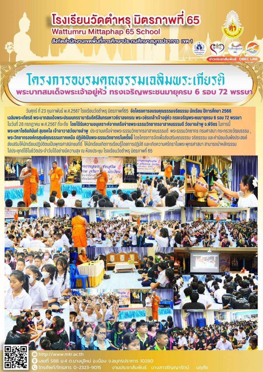 วันศุกร์ ที่ 23 กุมภาพันธ์ พ.ศ.2567 โรงเรียนวัดตำหรุ มิตรภาพที่65 จัดโครงการอบรมคุณธรรมจริยธรรม นักเรียน ปีการศึกษา 2566 เฉลิมพระเกียรติพระบาทสมเด็จพระปรเมนทรรามาธิบดีศรีสินทรมหาวชิราลงกรณ พระวชิรเกล้าเจ้าอยู่หัว ทรงเจริญพระชนมายุครบ 6 รอบ 72 พรรษา ในวันที่ 28 กรกฎาคม พ.ศ.2567 ที่จะถึง โดยได้รับความอนุเคราะห์จากเครือข่ายพระธรรมวิทยากรอาสาคนธรรมดี วัดบางลำพู จ.พิจิตร ในการนี้ พระมหาโชติอภินันท์ สุมงคโล เจ้าอาวาสวัดบางลำพู ประธานเครือข่ายพระธรรมวิทยากรอาสาคนธรรมดี พระธรรมวิทยากร กรมศาสนา กระทรวงวัฒนธรรม , พระวิทยากรองค์กรศูนย์คุณธรรมภาคเหนือ ปฏิบัติเป็นพระธรรมวิทยากรในครั้งนี้ โดยโครงการจัดเพื่อส่งเสริมคุณธรรม จริยธรรม และค่านิยมอันพึงประสงค์ส่งเสริมให้นักเรียนปฏิบัติตนเป็นพุทธศาสนิกชนที่ดี ให้นักเรียนเกิดการเรียนรู้โดยการปฏิบัติ และเกิดความศรัทธาในพระพุทธศาสนา สามารถนำหลักธรรมไปประยุกต์ใช้ในชีวิตประจำวันได้อย่างมีความสุข ณ ห้องประชุม โรงเรียนวัดตำหรุ มิตรภาพที่ 65 https://web.facebook.com/photo/?fbid=901948045056226&set=pcb.901951011722596&locale=th_TH