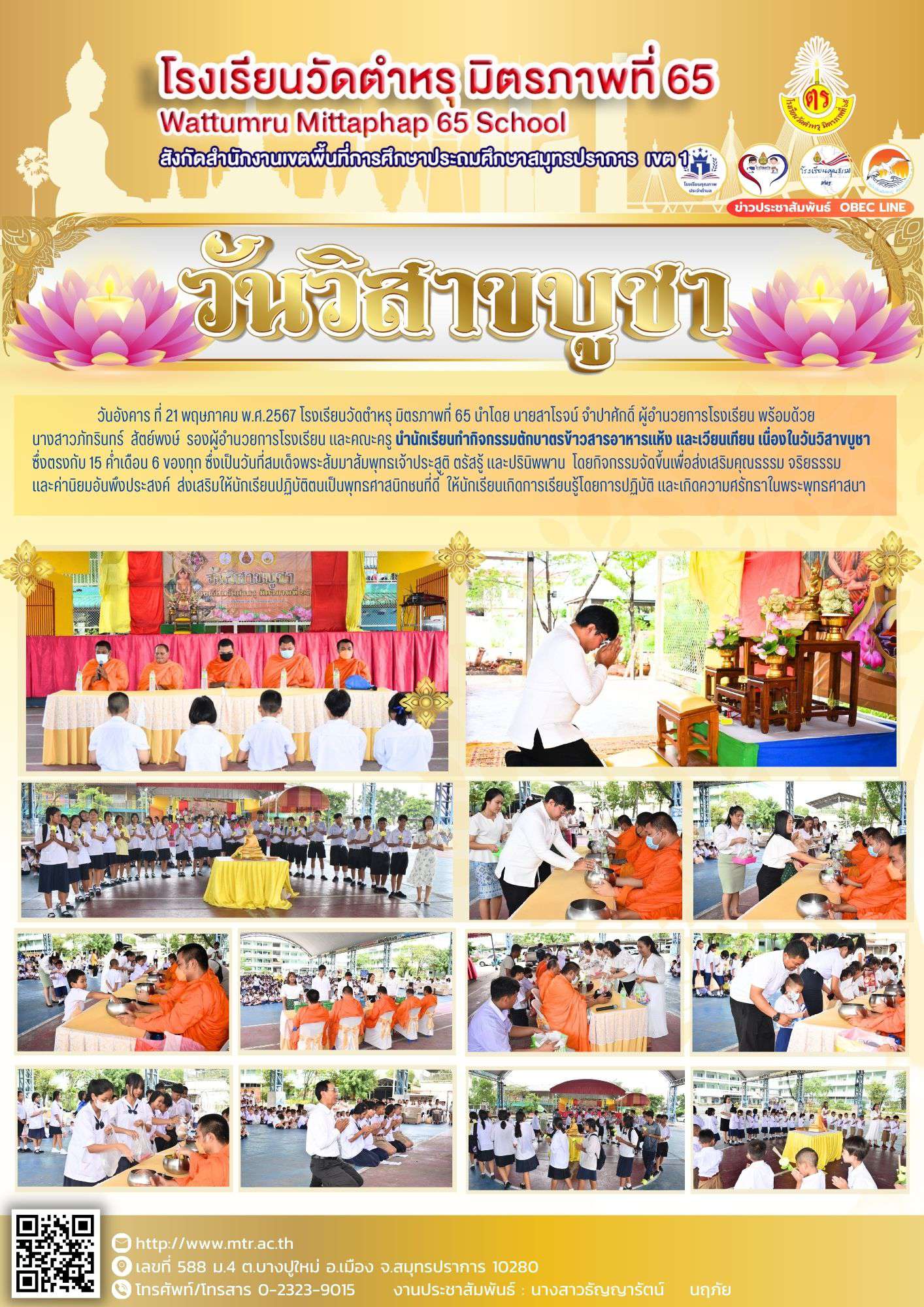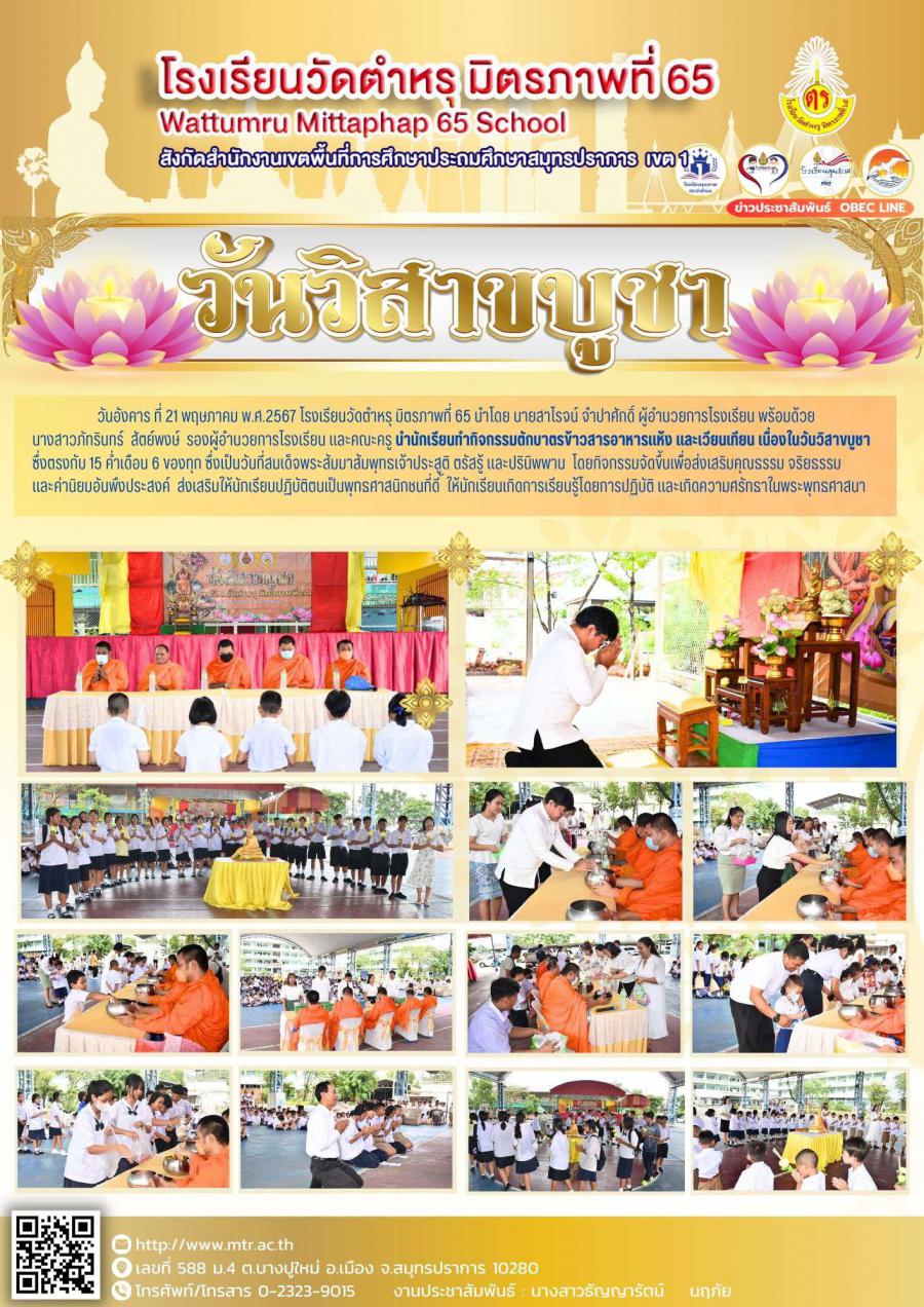 วันอังคาร ที่ 21 พฤษภาคม พ.ศ.2567 โรงเรียนวัดตำหรุ มิตรภาพที่ 65 นำโดย นายสาโรจน์ จำปาศักดิ์ ผู้อำนวยการโรงเรียน พร้อมด้วย นางสาวภัทรินทร์ สัตย์พงษ์ รองผู้อำนวยการโรงเรียน และคณะครู นำนักเรียนทำกิจกรรมตักบาตรข้าวสารอาหารแห้ง และเวียนเทียน เนื่องในวันวิสาขบูชา ซึ่งตรงกับ 15 ค่ำเดือน 6 ของทุก ซึ่งเป็นวันที่สมเด็จพระสัมมาสัมพุทธเจ้าประสูติ ตรัสรู้ และปรินิพพาน โดยกิจกรรมจัดขึ้นเพื่อส่งเสริมคุณธรรม จริยธรรม และค่านิยมอันพึงประสงค์ ส่งเสริมให้นักเรียนปฏิบัติตนเป็นพุทธศาสนิกชนที่ดี ให้นักเรียนเกิดการเรียนรู้โดยการปฏิบัติ และเกิดความศรัทธาในพระพุทธศาสนา https://www.facebook.com/share/p/pfNV4RDLrYkaRJaP/