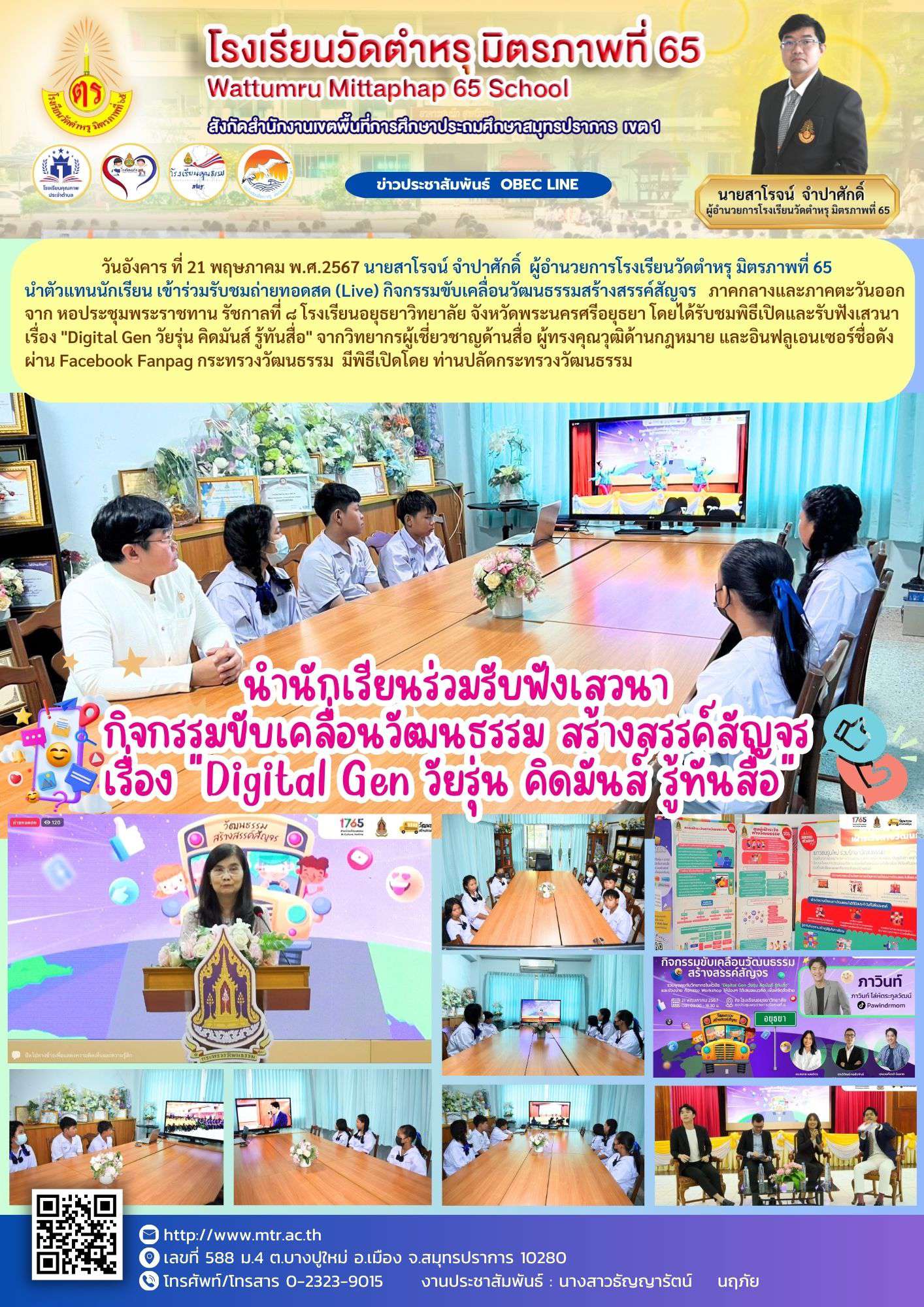 วันอังคาร ที่ 21 พฤษภาคม พ.ศ.2567 นายสาโรจน์ จำปาศักดิ์ ผู้อำนวยการโรงเรียนวัดตำหรุ มิตรภาพที่ 65 นำตัวแทนนักเรียน เข้าร่วมรับชมถ่ายทอดสด (Live) กิจกรรมขับเคลื่อนวัฒนธรรมสร้างสรรค์สัญจร ภาคกลางและภาคตะวันออกจาก หอประชุมพระราชทาน รัชกาลที่ ๘ โรงเรียนอยุธยาวิทยาลัย จังหวัดพระนครศรีอยุธยา โดยได้รับชมพิธีเปิดและรับฟังเสวนา เรื่อง Digital Gen วัยรุ่น คิดมันส์ รู้ทันสื่อ จากวิทยากรผู้เชี่ยวชาญด้านสื่อ ผู้ทรงคุณวุฒิด้านกฎหมาย และอินฟลูเอนเซอร์ชื่อดัง ผ่าน Facebook Fanpag กระทรวงวัฒนธรรม มีพิธีเปิดโดย ท่านปลัดกระทรวงวัฒนธรรม https://www.facebook.com/share/p/UPWX8e2Mq4pxPP2q/