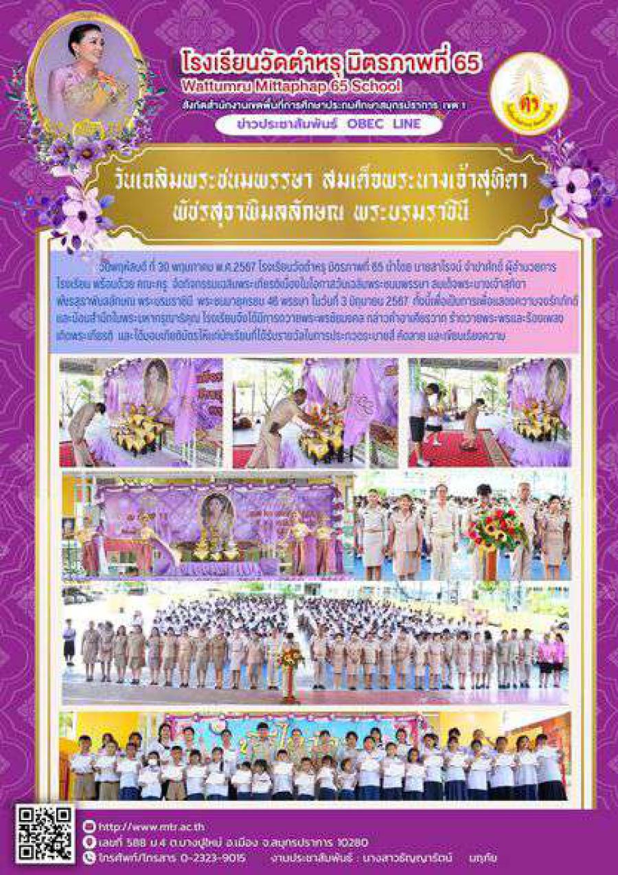 และน้อมสำนึกในพระมหากรุณาธิคุณ โรงเรียนจึงได้มีการถวายพระพรชัยมงคล กล่าวคำอาเศียรวาท รำถวายพระพรและร้องเพลงเทิดพระเกียรติ และได้มอบเกียติบัตรให้แก่นักเรียนที่ได้รับรางวัลในการประกวดระบายสี คัดลาย และเขียนเรียงความ https://www.facebook.com/share/p/EVKiknrNifBGddAt/