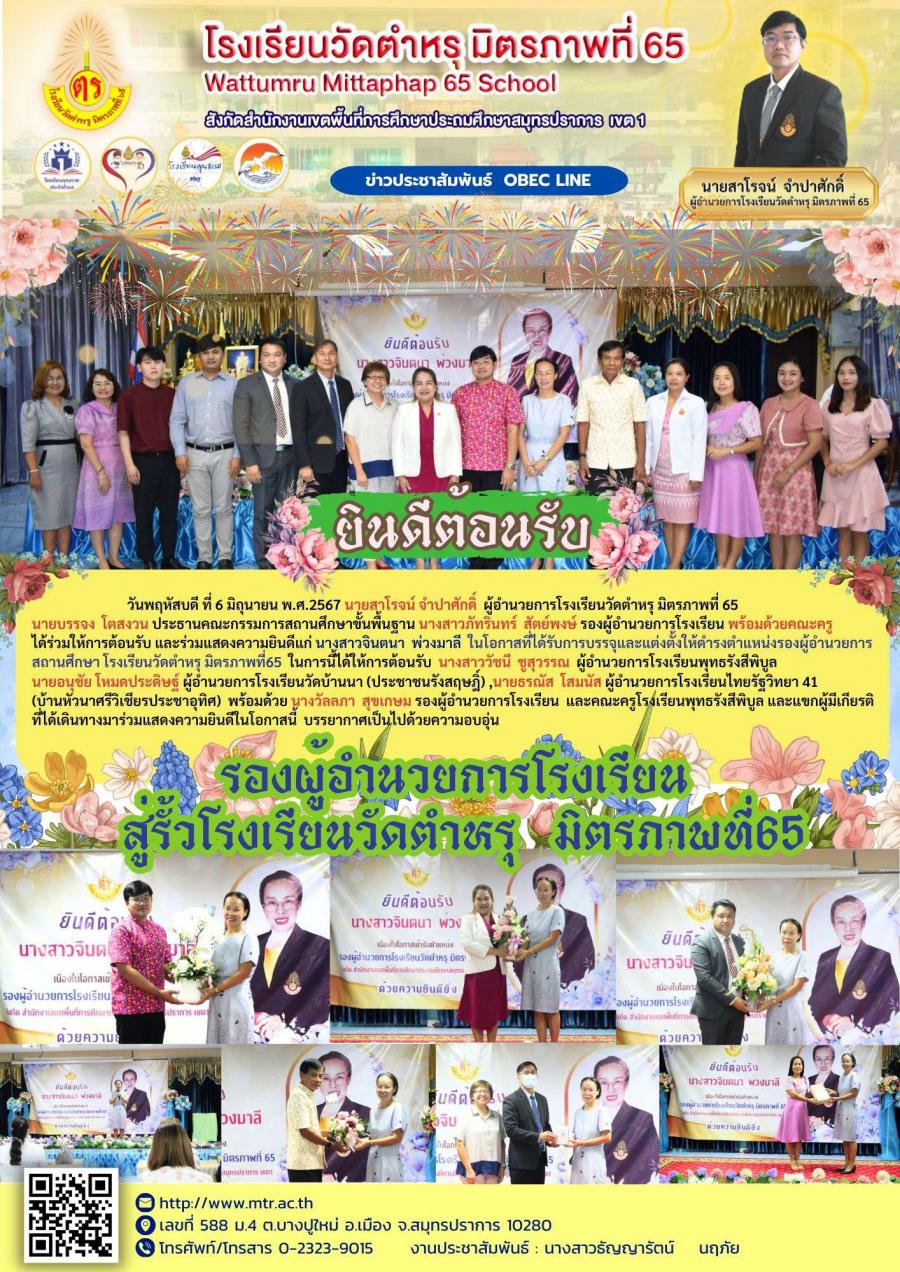 ให้การต้อนรับ และร่วมแสดงความยินดีแก่ นางสาวจินตนา พ่วงมาลี ในโอกาสที่ได้รับการบรรจุและแต่งตั้งให้ดำรงตำแหน่งรองผู้อำนวยการสถานศึกษา โรงเรียนวัดตำหรุ มิตรภาพที่65