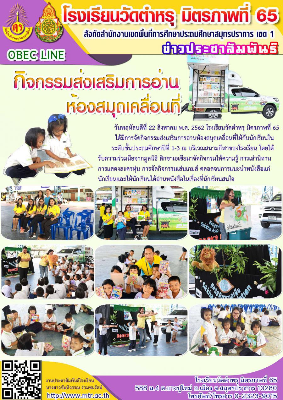 วันพฤหัสบดีที่ 22 สิงหาคม พ.ศ. 2562 โรงเรียนวัดตำหรุ มิตรภาพที่ 65 ได้มีการจัดกิจกรรมส่งเสริมการอ่านห้องสมุดเคลื่อนที่ให้กับนักเรียนในระดับชั้นประถมศึกษาปีที่ 1-3 ณ บริเวณสนามกีฬาของโรงเรียน โดยได้รับความร่วมมือจากมูลนิธิ สิกขาเอเซียมาจัดกิจกรมให้ความรู้ การเล่านิทาน การแสดงละครหุ่น การจัดกิจกรรมเล่นเกมส์ ตลอดจนการแนะนำหนังสือแก่นักเรียนและให้นักเรียนได้อ่านหนังสือในเรื่องที่นักเรียนสนใจ
