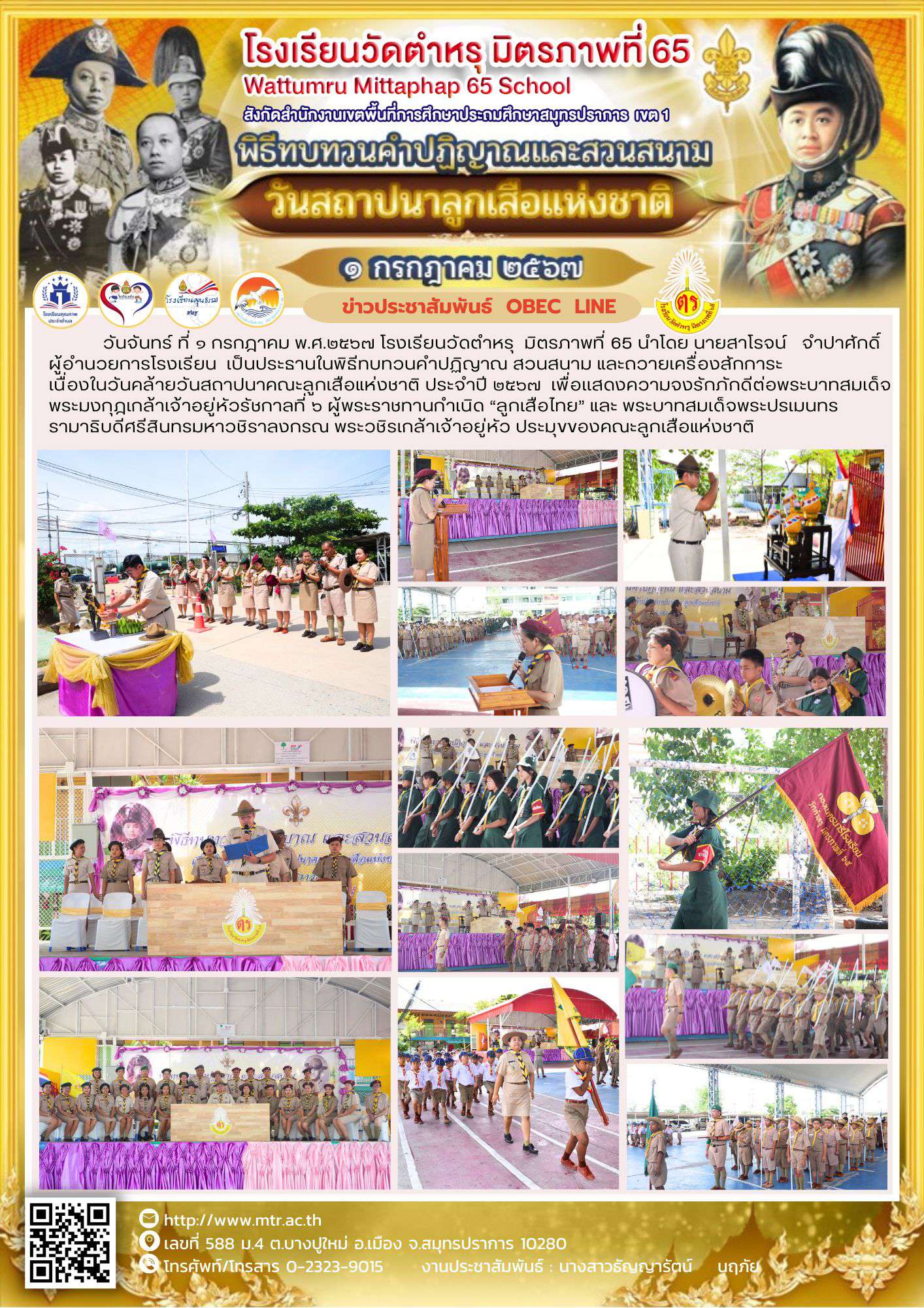 วันจันทร์ ที่ ๑ กรกฎาคม พ.ศ.๒๕๖๗ โรงเรียนวัดตำหรุ มิตรภาพที่ 65 นำโดย นายสาโรจน์ จำปาศักดิ์ ผู้อำนวยการโรงเรียน เป็นประธานในพิธีทบทวนคำปฏิญาณ สวนสนาม และถวายเครื่องสักการะ เนื่องในวันคล้ายวันสถาปนาคณะลูกเสือแห่งชาติ ประจำปี ๒๕๖๗ เพื่อเเสดงความจงรักภักดีต่อพระบาทสมเด็จพระมงกุฎเกล้าเจ้าอยู่หัวรัชกาลที่ ๖ ผู้พระราชทานกำเนิด ลูกเสือไทย และ พระบาทสมเด็จพระปรเมนทรรามาธิบดีศรีสินทรมหาวชิราลงกรณ พระวชิรเกล้าเจ้าอยู่หัว ประมุขของคณะลูกเสือแห่งชาติ https://www.facebook.com/share/p/5qusH4YkA7KfPdUG/