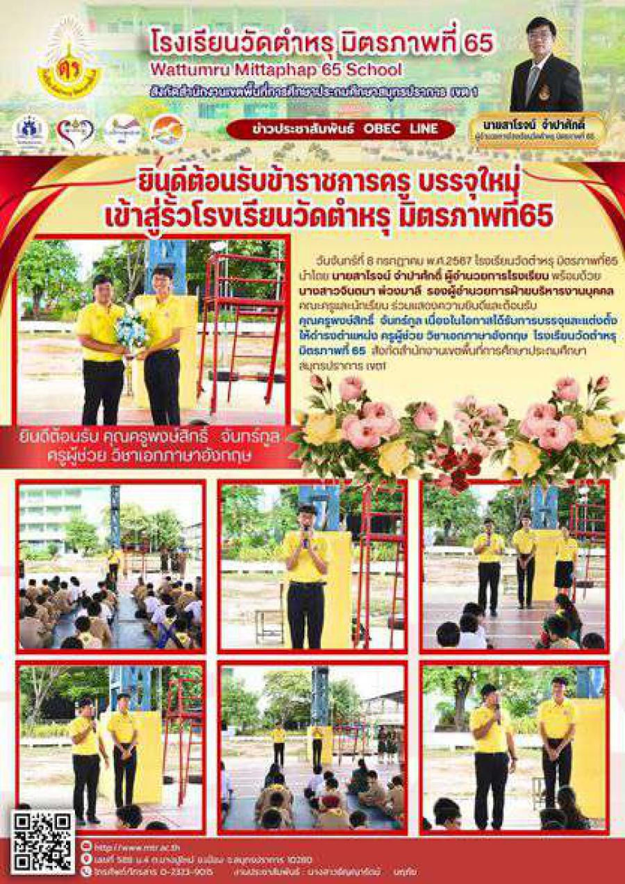 วันจันทร์ที่ 8 กรกฎาคม พ.ศ.2567 โรงเรียนวัดตำหรุ มิตรภาพที่65 นำโดย นายสาโรจน์ จำปาศักดิ์ ผู้อำนวยการโรงเรียน พร้อมด้วย นางสาวจินตนา พ่วงมาลี รองผู้อำนวยการฝ่ายบริหารงานบุคคล คณะครูและนักเรียน ร่วมแสดงความยินดีและต้อนรับ คุณครูพงษ์สิทธิ์ จันทร์กูล เนื่องในโอกาสได้รับการบรรจุและแต่งตั้งให้ดำรงตำแหน่ง ครูผู้ช่วย วิชาเอกภาษาอังกฤษ โรงเรียนวัดตำหรุ มิตรภาพที่ 65 สังกัดสำนักงานเขตพื้นที่การศึกษาประถมศึกษาสมุทรปราการ เขต1 https://www.facebook.com/share/p/PjTBsuPzKYNf58XL/