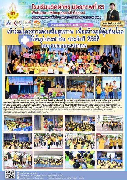 วันพุธ ที่10 กรกฏาคม พ.ศ.2567 นายสาโรจน์ จำปาศักดิ์ ผู้อำนวยการโรงเรียน มอบหมายให้ นางสาวจินตนา พ่วงมาลี นางสาวภัทรินทร์ สัตย์พงษ์ รองผู้อำนวยการโรงเรียน และคณะครู นำนักเรียนชั้นประถมศึกษาปีที่ 3 - ประถมศึกษาปีที่ 6 เข้าร่วมโครงการส่งเสริมสุขภาพเพื่อสร้างภูมิคุ้มกันโรคให้ประชาชน ประจำปี 2567 โดยองค์การบริหารส่วนจังหวัดสมุทรปราการ