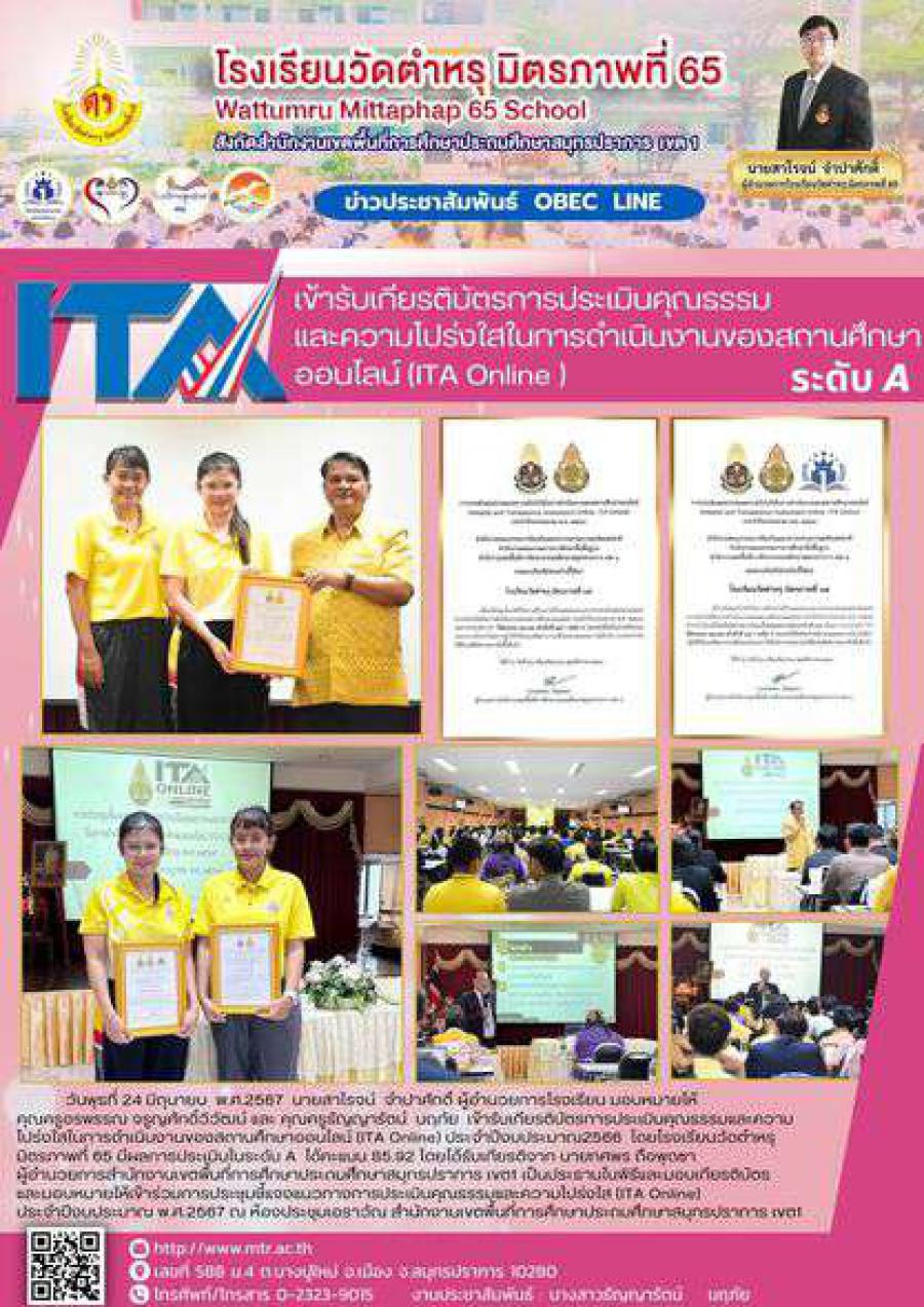 วันพุธที่ 24 มิถุนายน พ.ศ.2567 นายสาโรจน์ จำปาศักดิ์ ผู้อำนวยการโรงเรียน มอบหมายให้ คุณครูอรพรรณ จรูญศักดิ์วิวัฒน์ และ คุณครูธัญญารัตน์ นฤภัย เข้ารับเกียรติบัตรการประเมินคุณธรรมและความโปร่งใสในการดำเนินงานของสถานศึกษาออนไลน์ (ITA Online) ประจำปีงบประมาณ2566 โดยโรงเรียนวัดตำหรุ มิตรภาพที่ 65 มีผลการประเมินในระดับ A ได้คะแนน 85.92 โดยได้รับเกียรติจาก นายทศพร ถือพุดซา ผู้อำนวยการสำนักงานเขตพื้นที่การศึกษาประถมศึึกษาสมุทรปราการ เขต1 เป็นประธานในพิธีและมอบเกียรติบัตร และมอบหมายให้เข้าร่วมการประชุมชี้แจงแนวทางการประเมินคุณธรรมและความโปร่งใส (ITA Online) ประจำปีงบประมาณ พ.ศ.2567 ณ ห้องประชุมเอราวัณ สำนักงานเขตพื้นที่การศึกษาประถมศึกษาสมุทรปราการ เขต1 https://www.facebook.com/share/p/9VGVdVfAKHAoUi5a/
