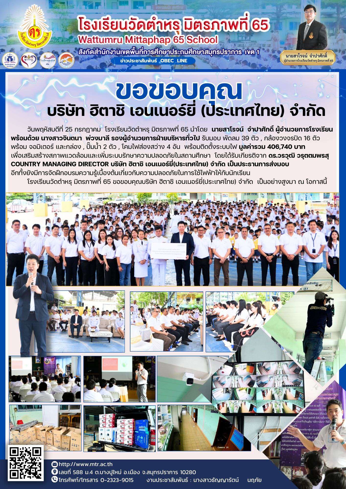 โรงเรียนวัดตำหรุ มิตรภาพที่ 65 ขอขอบคุณบริษัท ฮิตาชิ เอนเนอร์ยี่(ประเทศไทย) จำกัด เป็นอย่างสูงมา ณ โอกาสนี้ https://www.facebook.com/share/p/pZWxTBSmpQ4XYYmw/