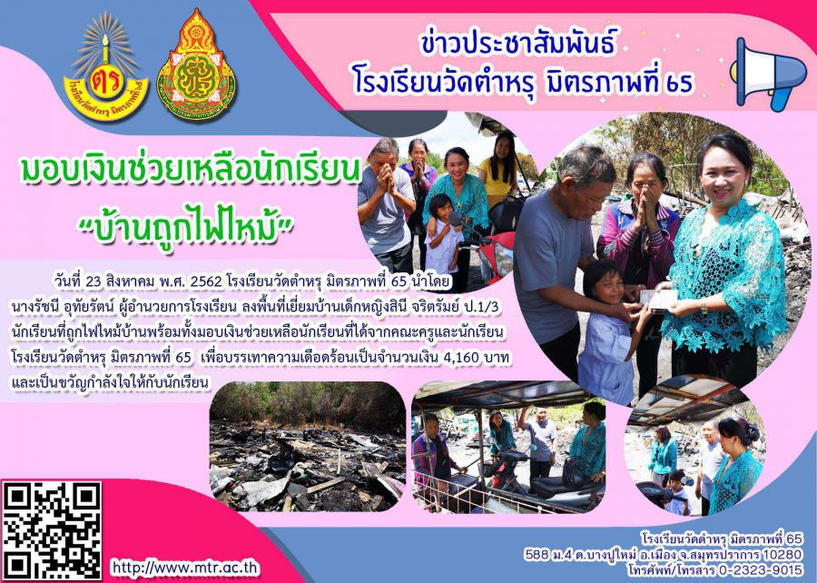 วันที่ 23 สิงหาคม พ.ศ. 2562 โรงเรียนวัดตำหรุ มิตรภาพที่ 65 นำโดยนางรัชนี อุทัยรัตน์ ผู้อำนวยการโรงเรียน ลงพื้นที่เยี่ยมบ้านเด็กหญิงสินี จริตรัมย์ ป.1/3 นักเรียนที่ถูกไฟไหม้บ้านพร้อมทั้งมอบเงินช่วยเหลือนักเรียนที่ได้จากคณะครูและนักเรียนโรงเรียนวัดตำหรุ มิตรภาพที่ 65 เพื่อบรรเทาความเดือดร้อนเป็นจำนวนเงิน 4,160 บาท และเป็นขวัญกำลังใจให้กับนักเรียน