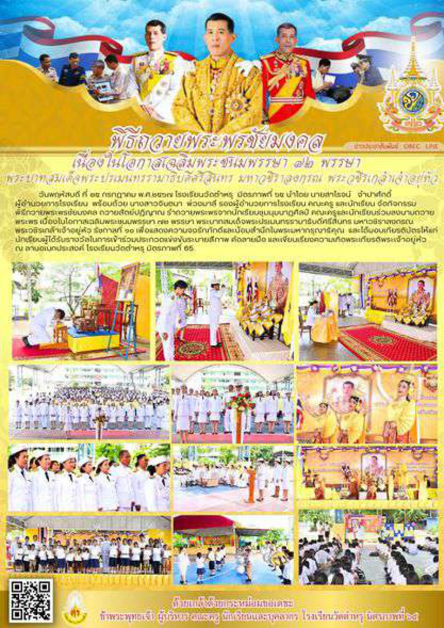 จัดกิจกรรมพิธีถวายพระพรชัยมงคล ถวายสัตย์ปฏิญาณ รำถวายพระพรจากนักเรียนชุมนุมนาฏศิลป์ คณะครูและนักเรียนร่วมลงนามถวายพระพร เนื่องในโอกาสเฉลิมพระชนมพรรษา ๗๒ พรรษา พระบาทสมเด็จพระปรเมนทรรามาธิบดีศรีสินทร ม