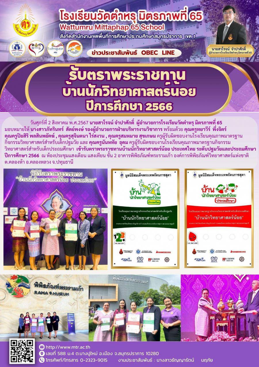 วันศุกร์ที่ 2 สิงหาคม พ.ศ.2567 นายสาโรจน์ จำปาศักดิ์  ผู้อำนวยการโรงเรียนวัดตำหรุ มิตรภาพที่ 65มอบหมายให้ นางสาวภัทรินทร์  สัตย์พงษ์ รองผู้อำนวยการฝ่ายบริหารงานวิชาการ พร้อมด้วย คุณครูทยาวีร์  พึ่งจิตร์ , คุณครูปิยสิริ พลสินพยัคฆ์ , คุณครูสุจินตนา ไร่สงวน , คุณครูสมหมาย สุขเกษม ครูผู้รับผิดชอบงานโรงเรียนคุณภาพมาตรฐานกิจกรรมวิทยาศาสตร์สำหรับเด็กปฐมวัย และ คุณครูนันหทัย  อุดม ครูผู้รับผิดชอบงานโรงเรียนคุณภาพมาตรฐานกิจกรรมวิทยาศาสตร์สำหรับเด็กประถมศึกษา  เข้ารับตราพระราชทานบ้านนักวิทยาศาสตร์น้อย ประเทศไทย ระดับปฐมวัยและประถมศึกษา ปีการศึกษา 2566  ณ ห้องประชุมแสงเดือน แสงเทียน ชั้น 2 อาคารพิพิธภัณฑ์พระรามเก้า องค์การพิพิธภัณฑ์วิทยาศาสตร์แห่งชาติ ต.คลองห้า อ.คลองหลวง จ.ปทุมธานี