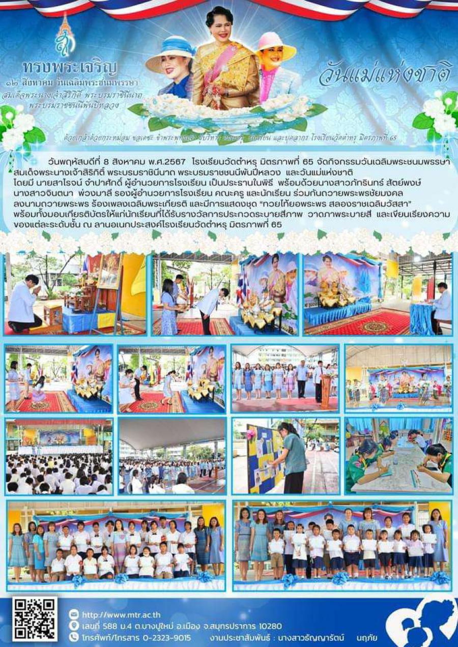 วันพฤหัสบดีที่ 8 สิงหาคม พ.ศ.2567  โรงเรียนวัดตำหรุ มิตรภาพที่ 65 จัดกิจกรรมวันเฉลิมพระชนมพรรษาสมเด็จพระนางเจ้าสิริกิติ์ พระบรมราชินีนาถ พระบรมราชชนนีพันปีหลวง  และวันแม่แห่งชาติ โดยมี นายสาโรจน์ จำปาศักดิ์ ผู้อำนวยการโรงเรียน เป็นประธานในพิธี  พร้อมด้วยนางสาวภัทรินทร์ สัตย์พงษ์  นางสาวจินตนา  พ่วงมาลี รองผู้อำนวยการโรงเรียน คณะครู และนักเรียน ร่วมกันถวายพระพรชัยมงคล ลงนามถวายพระพร ร้องเพลงเฉลิมพระเกียรติ และมีการแสดงชุด “ทวยไท้ยอพระพร สลองราชเฉลิมวัสสา”    พร้อมทั้งมอบเกียรติบัตรให้แก่นักเรียนที่ได้รับรางวัลการประกวดระบายสีภาพ วาดภาพระบายสี และเขียนเรียงความ ของแต่ละระดับชั้น ณ ลานอเนกประสงค์โรงเรียนวัดตำหรุ มิตรภาพที่ 65 https://m.facebook.com/story.php?story_fbid=pfbid0P6sxUctZ3mNLnW2CHuX4jqJhXK7CZeXgnP2ZesCpdaha8YRPtmroxnZqLbg62UUzl&id=100057231168612
