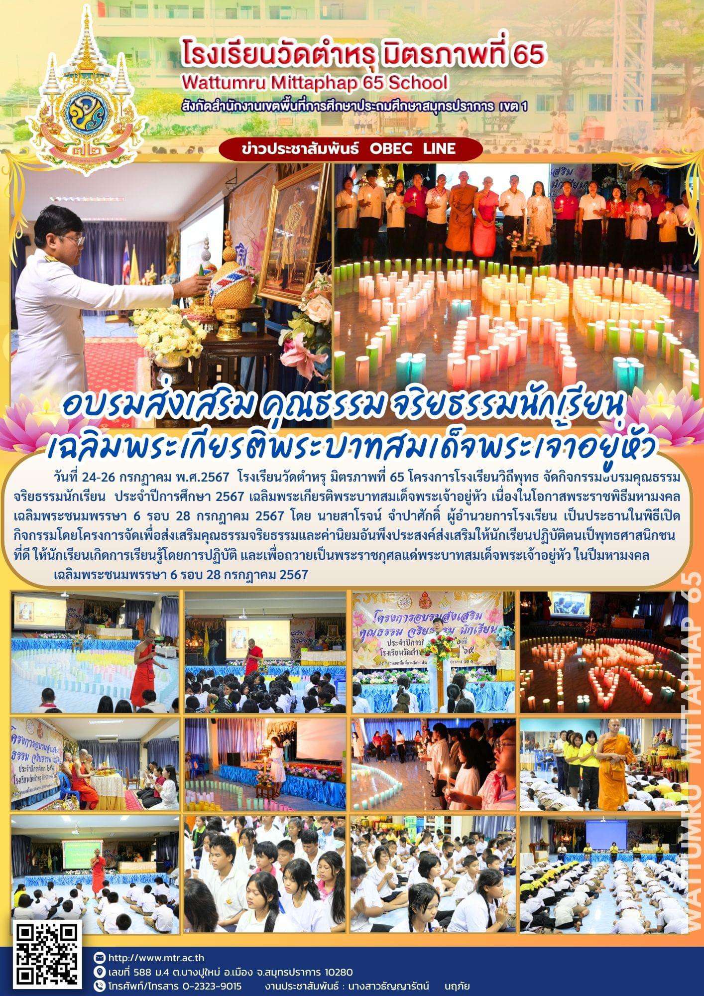 วันที่ 24-26 กรกฏาคม พ.ศ.2567  โรงเรียนวัดตำหรุ มิตรภาพที่ 65 โครงการโรงเรียนวิถีพุทธ จัดกิจกรรมอบรมคุณธรรม จริยธรรมนักเรียน  ประจำปีการศึกษา 2567 เฉลิมพระเกียรติพระบาทสมเด็จพระเจ้าอยู่หัว เนื่องในโอกาสพระราชพิธีมหามงคลเฉลิมพระชนมพรรษา 6 รอบ 28 กรกฎาคม 2567 โดย นายสาโรจน์ จำปาศักดิ์ ผู้อำนวยการโรงเรียน เป็นประธานในพิธีเปิดกิจกรรมโดยโครงการจัดเพื่อส่งเสริมคุณธรรมจริยธรรมและค่านิยมอันพึงประสงค์ส่งเสริมให้นักเรียนปฏิบัติตนเป็นพุทธศาสนิกชนที่ดี ให้นักเรียนเกิดการเรียนรู้โดยการปฏิบัติ และเพื่อถวายเป็นพระราชกุศลแด่พระบาทสมเด็จพระเจ้าอยู่หัว ในปีมหามงคล เฉลิมพระชนมพรรษา 6 รอบ 28 กรกฎาคม 2567
