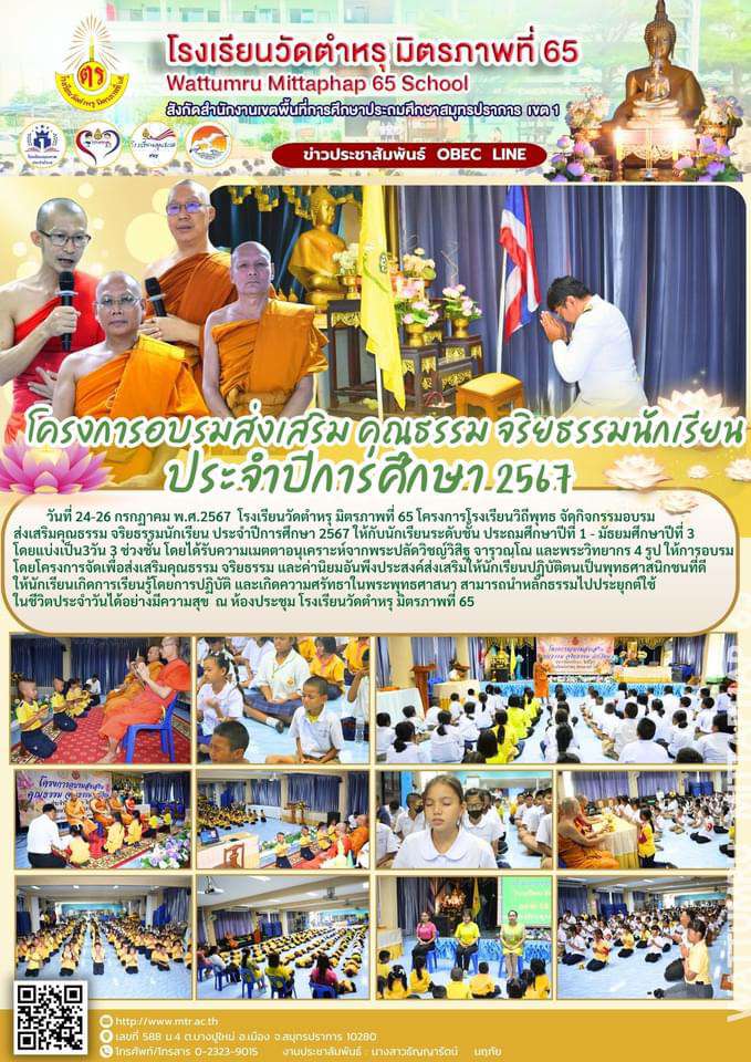 วันที่ 24-26 กรกฏาคม พ.ศ.2567  โรงเรียนวัดตำหรุ มิตรภาพที่ 65 โครงการโรงเรียนวิถีพุทธ จัดกิจกรรมอบรมส่งเสริมคุณธรรม จริยธรรมนักเรียน ประจำปีการศึกษา 2567 ให้กับนักเรียนระดับชั้น ประถมศึกษาปีที่ 1 - มัธยมศึกษาปีที่ 3โดยแบ่งเป็น3วัน 3 ช่วงชั้น โดยได้รับความเมตตาอนุเคราะห์จากพระปลัดวิชญ์วิสิฐ จารุวณฺโณ และพระวิทยากร 4 รูป ให้การอบรมโดยโครงการจัดเพื่อส่งเสริมคุณธรรม จริยธรรม และค่านิยมอันพึงประสงค์ส่งเสริมให้นักเรียนปฏิบัติตนเป็นพุทธศาสนิกชนที่ดี ให้นักเรียนเกิดการเรียนรู้โดยการปฏิบัติ และเกิดความศรัทธาในพระพุทธศาสนา สามารถนำหลักธรรมไปประยุกต์ใช้ในชีวิตประจำวันได้อย่างมีความสุข  ณ ห้องประชุม โรงเรียนวัดตำหรุ มิตรภาพที่ 65