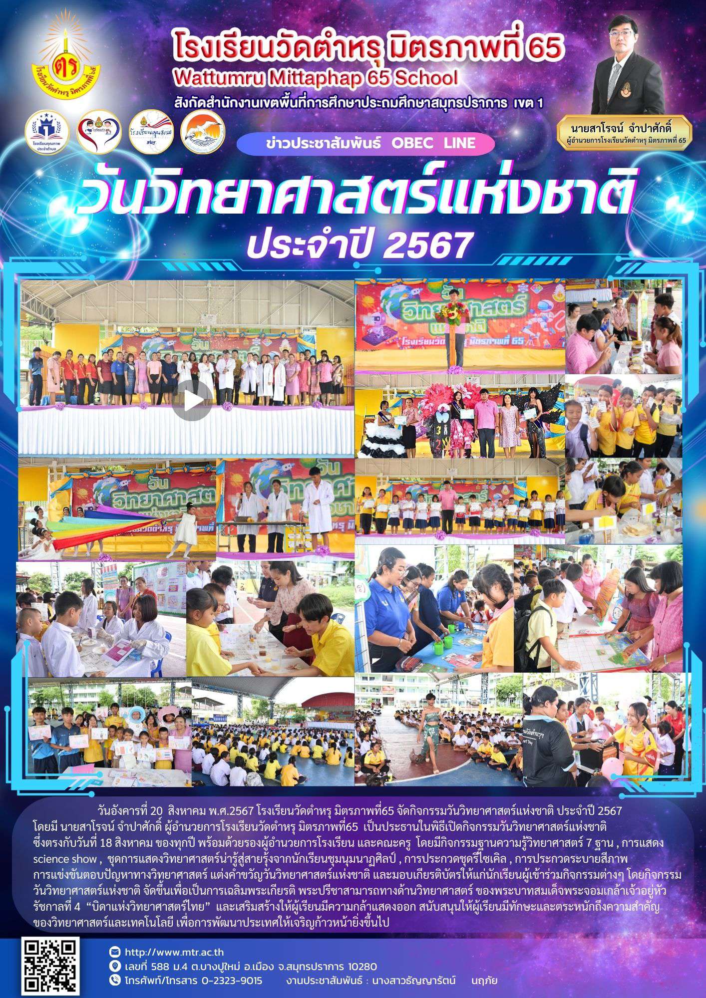 วันอังคารที่ 20 สิงหาคม พ.ศ.2567 โรงเรียนวัดตําหรุ มิตรภาพที่65 จัดกิจกรรมวันวิทยาศาสตร์แห่งชาติ ประจําปี 2567 โดยมี นายสาโรจน์ จําปาศักดิ์ ผู้อํานวยการโรงเรียนวัดตําหรุ มิตรภาพที่65 เป็นประธานในพิธีเปิดกิจกรรมวันวิทยาศาสตร์แห่งชาติ ซึ่งตรงกับวันที่ 18 สิงหาคม ของทุกปี พร้อมด้วย รองผู้อํานวยการโรงเรียน และคณะครู โดยมีกิจกรรมฐานความรู้วิทยาศาสตร์ 7 ฐาน, การแสดง science show, ชุดการแสดงวิทยาศาสตร์น่ารู้สู่สายรุ้งจากนักเรียนชุมนุมนาฏศิลป์, การประกวดชุดรีไซเคิล, การประกวดระบายสีภาพ การแข่งขันตอบปัญหาทางวิทยาศาสตร์ แต่งคําขวัญวันวิทยาศาสตร์แห่งชาติ และมอบเกียรติบัตรให้แก่นักเรียนผู้เข้าร่วมกิจกรรมต่างๆ โดยกิจกรรม วันวิทยาศาสตร์แห่งชาติ จัดขึ้นเพื่อเป็นการเฉลิมพระเกียรติ พระปรีชาสามารถทางด้านวิทยาศาสตร์ ของพระบาทสมเด็จพระจอมเกล้าเจ้าอยู่หัว รัชกาลที่ 4 “บิดาแห่งวิทยาศาสตร์ไทย” และเสริมสร้างให้ผู้เรียนมีความกล้าแสดงออก สนับสนุนให้ผู้เรียนมีทักษะและตระหนักถึงความสําคัญ ของวิทยาศาสตร์และเทคโนโลยี เพื่อการพัฒนาประเทศให้เจริญก้าวหน้ายิ่งขึ้นไป https://www.facebook.com/share/p/DW1dEcycurrD1NYV/